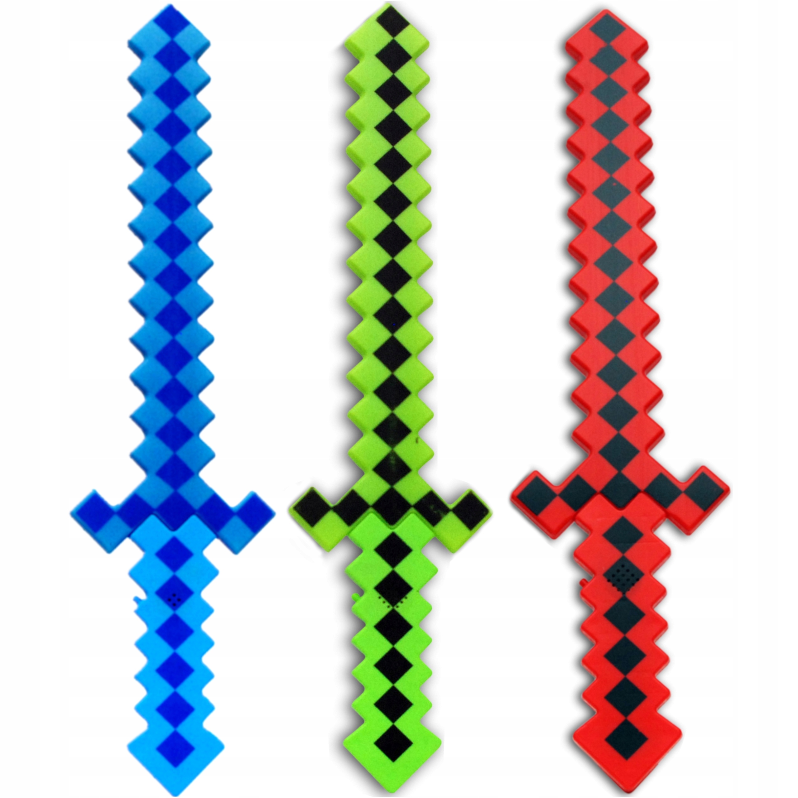 Набор изготовлен из прочного и безопасного пластика. Каждая игрушка имеет переключатель в ручке - когда она включается в светодиоды начинает сиять в разных цветах, и игрушка начинает звучать во время боя с мечом или топором и стрельбы из винтовки.