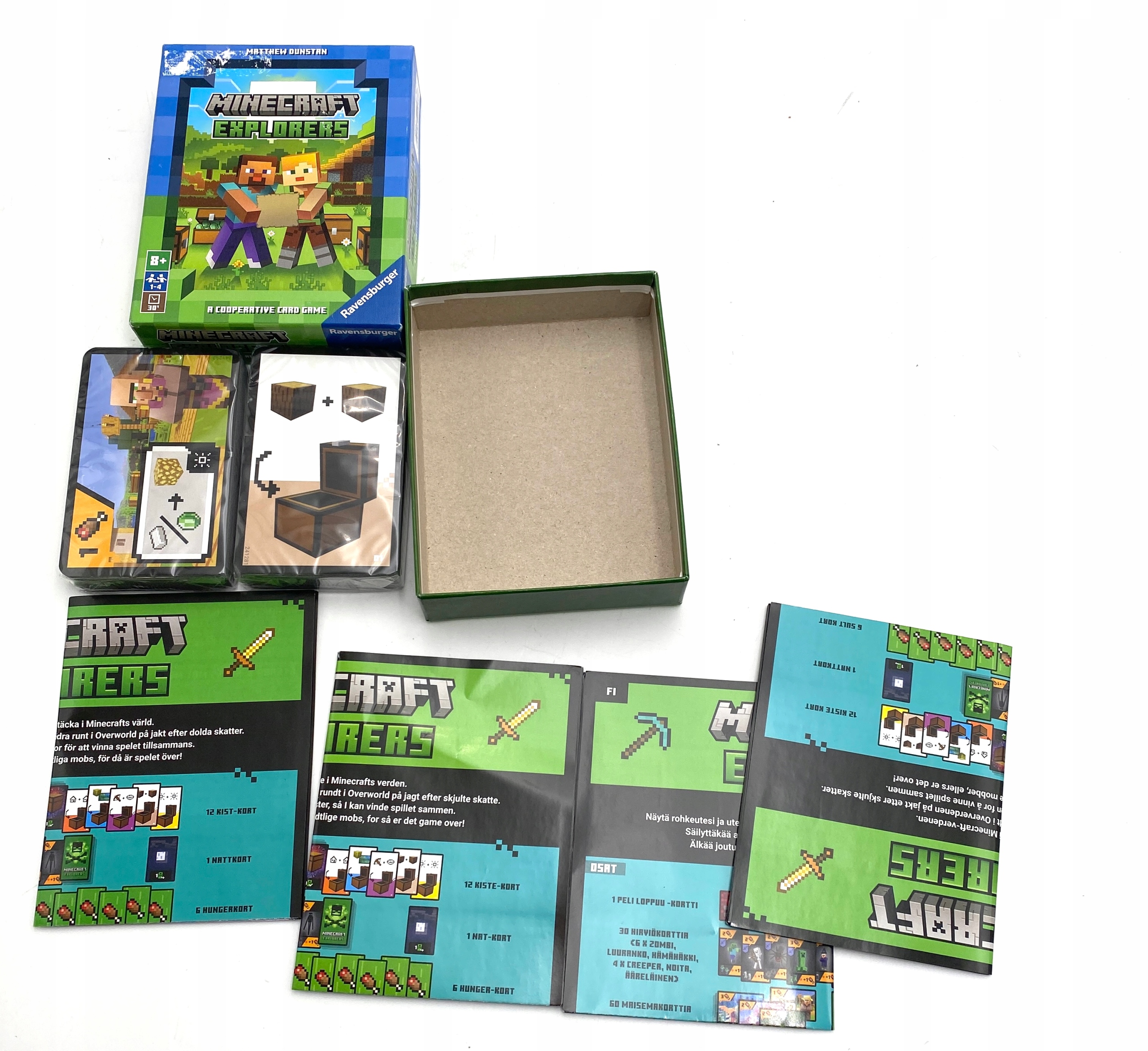 В Minecraft Explorers вы вместе будете исследовать игровой мир в поисках предметов, изображенных на сундуках. Вы сразу выиграете, если вам удастся заполнить все сундуки, кроме одного, необходимыми предметами. Вы сами решаете, какие сундуки хотите наполнить, и можете передумать во время игры. Но нужно спешить! Открытие карты «ИГРА ЗАКОНЧЕНА» означает немедленное поражение. Чем быстрее исчезают карты в стопке мобов, тем ближе вы к проигрышу.