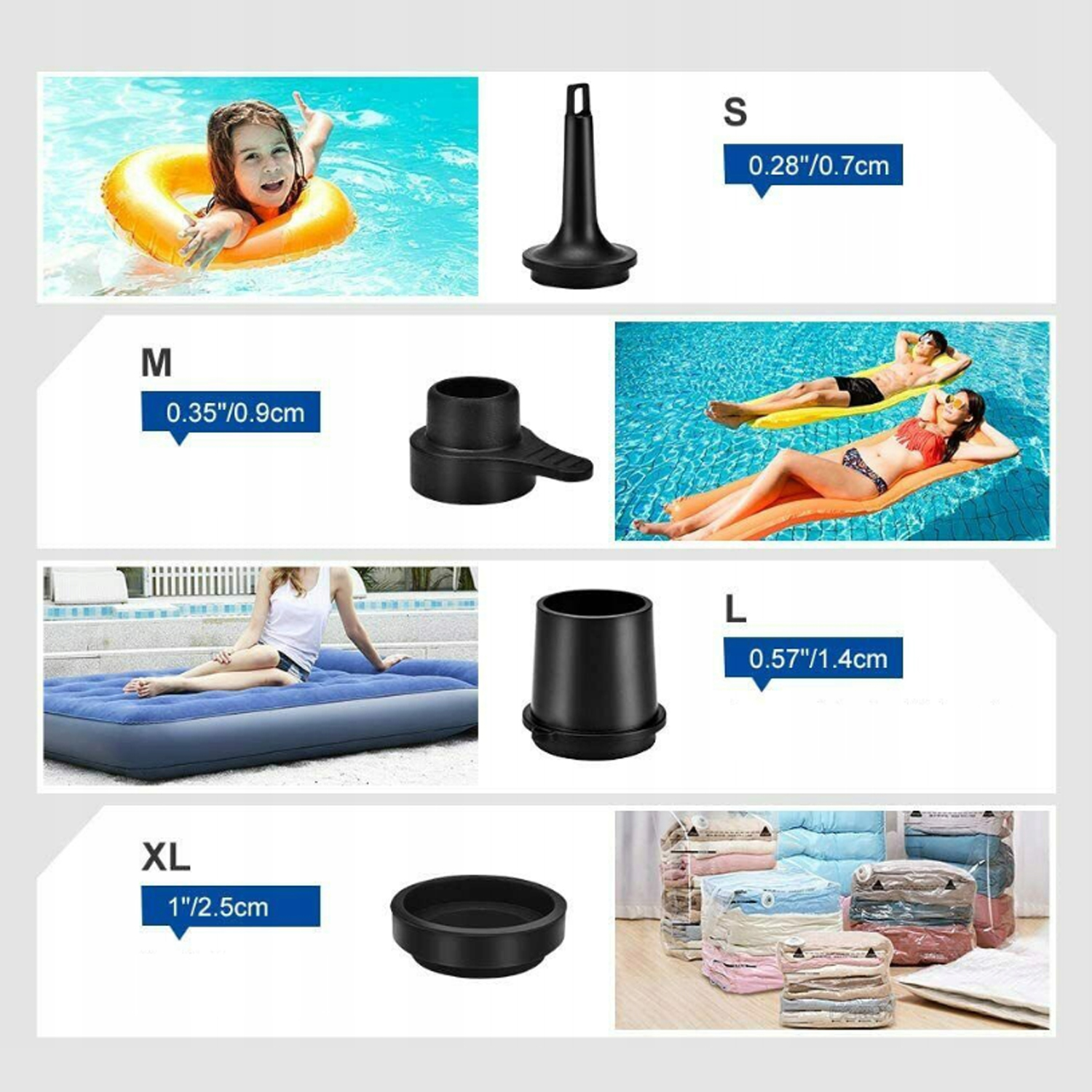 Перекачивание. Идеально подходит для надувных матрасов, матрасов, надувных бассейнов, плавательных колес, бассейнов, шаров для йоги, воздушных шаров и других надувных предметов. Кроме того, его также можно использовать в вакуумных мешках для технического обслуживания, чтобы высосать весь избыток воздуха из вакуумных мешков.