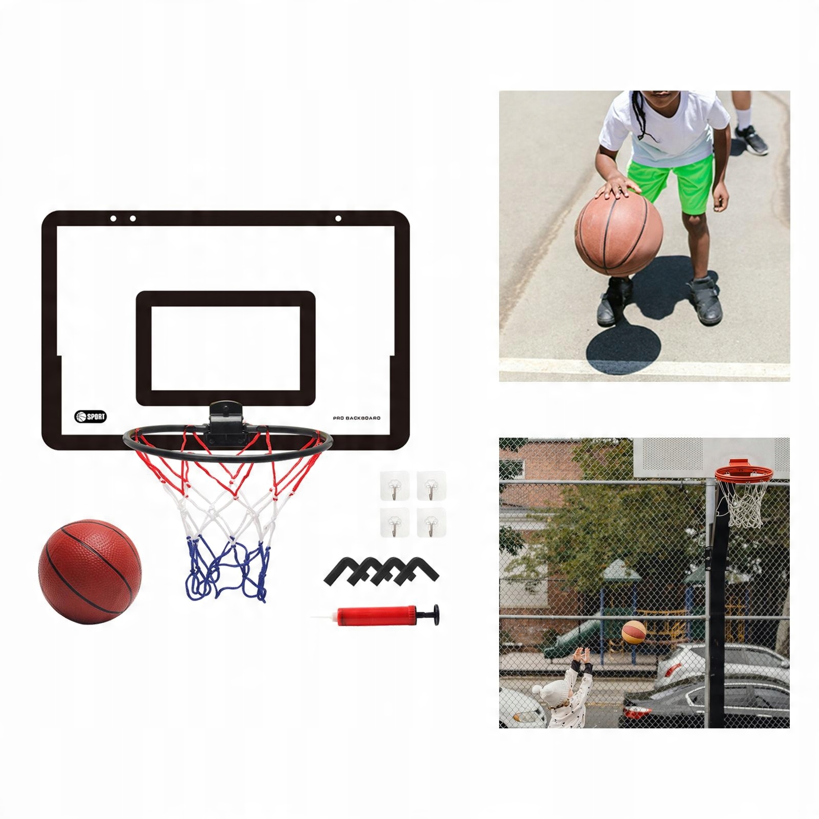 Набор содержит 1 баскетбольную доску, 1 насос, 1 баскетбольная сетка, 1 баскетбольный мяч, 4 пены EVA, 4 крючка. Они уменьшают шум, вызванный трением во время упражнений. Они обязательно понравятся