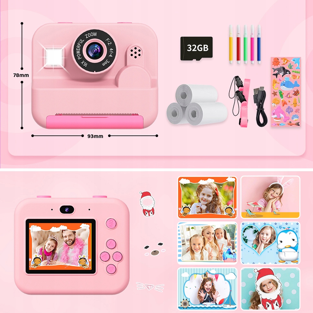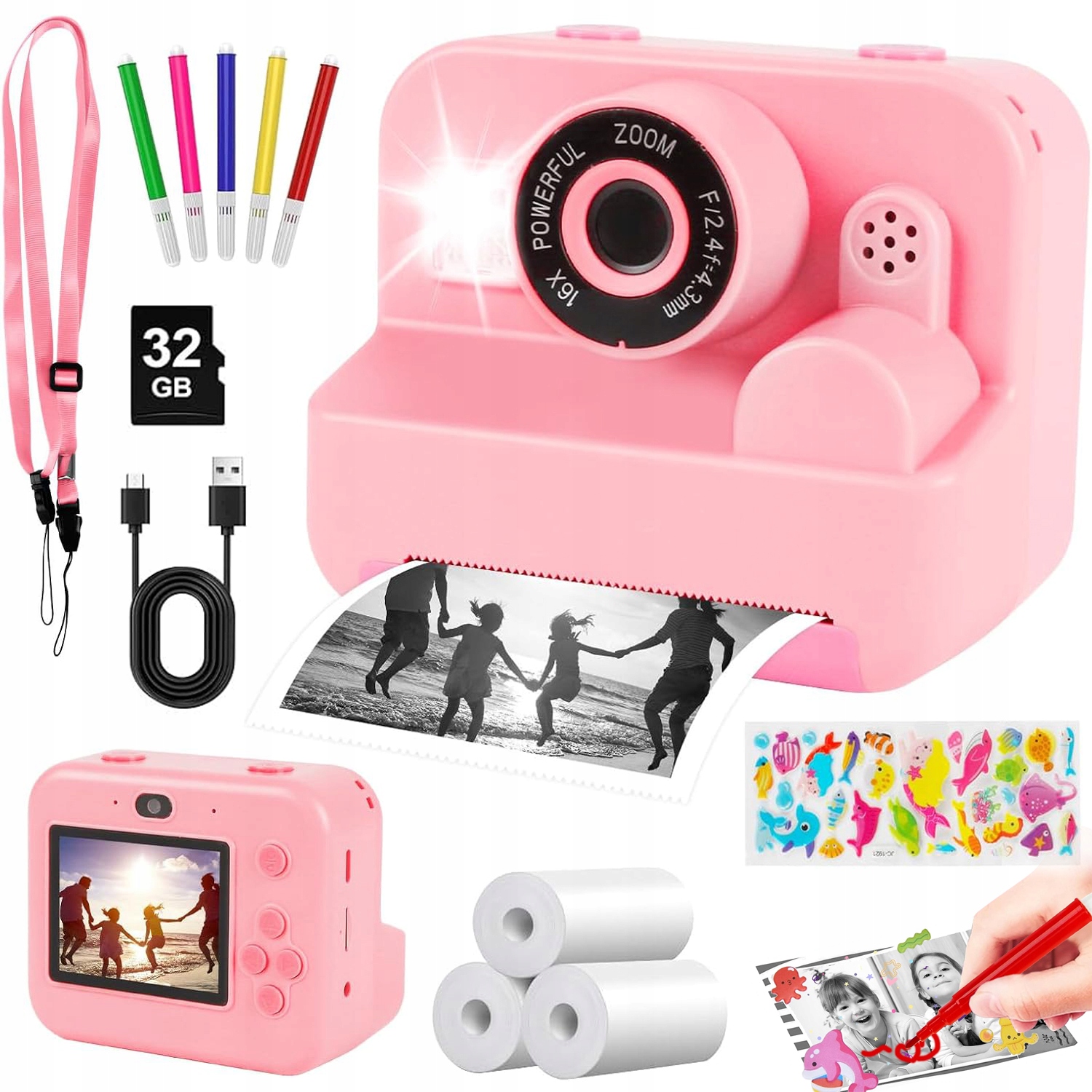 - Мгновенная камера оснащена большим экраном с диагональю 2,4 -дюйма и разрешением 1080p HD. Использует передовую технологию тепловой печати без использования туши. Благодаря этому дети могут делать свои любимые фотографии за несколько секунд, а затем рисовать с разноцветными ручками.