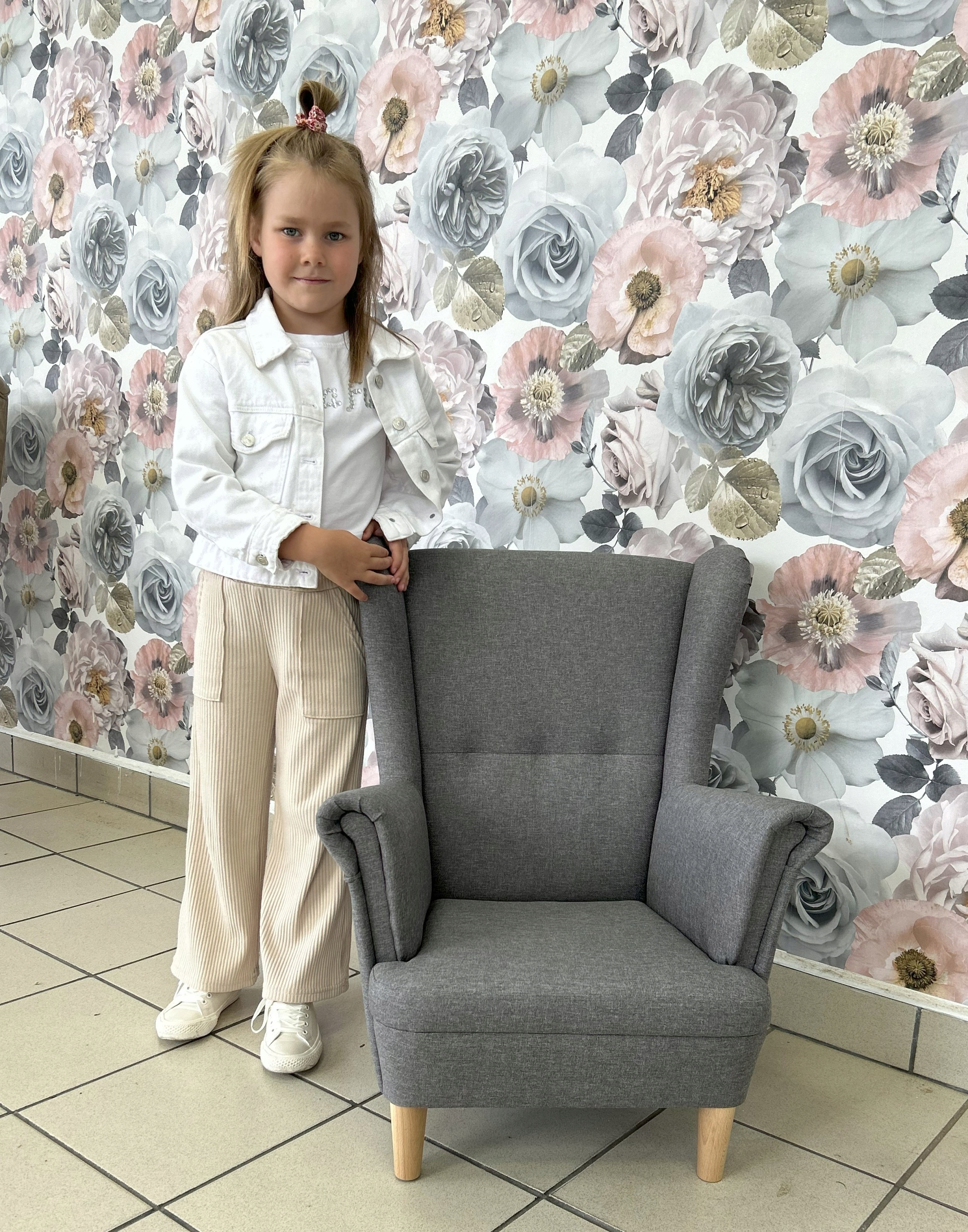 Мини -кресло Усзак был создан для детей. Сделано из сопоставки, обитаемой в высококачественной ошибке. Стабильность обеспечивается 10 сантиметрами деревянных ног. Пена, используемая на сиденье, сопротивление и подлокотники, обеспечивает высокий комфорт сидения.