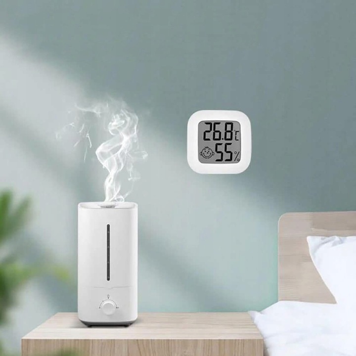 Термометр имеет два способа крепления: он может стоять прямо на столе, столе, тумбочке, но мы также можем прикрепить термометр к стене с помощью держателя с двухсторонней лента.