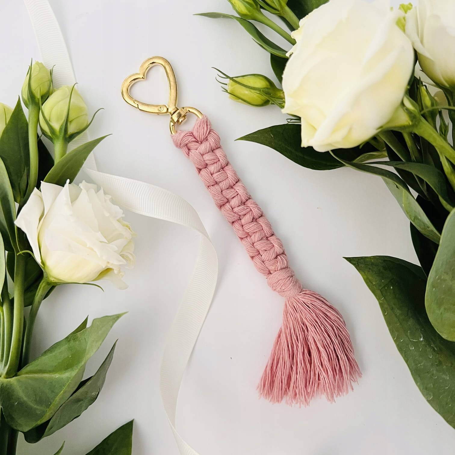Ключевая ручная клавиша - техника макрома. Он изготовлен из порошковой розовой хлопчатобумажной струны и имеет золотистого золотистого карабинера.