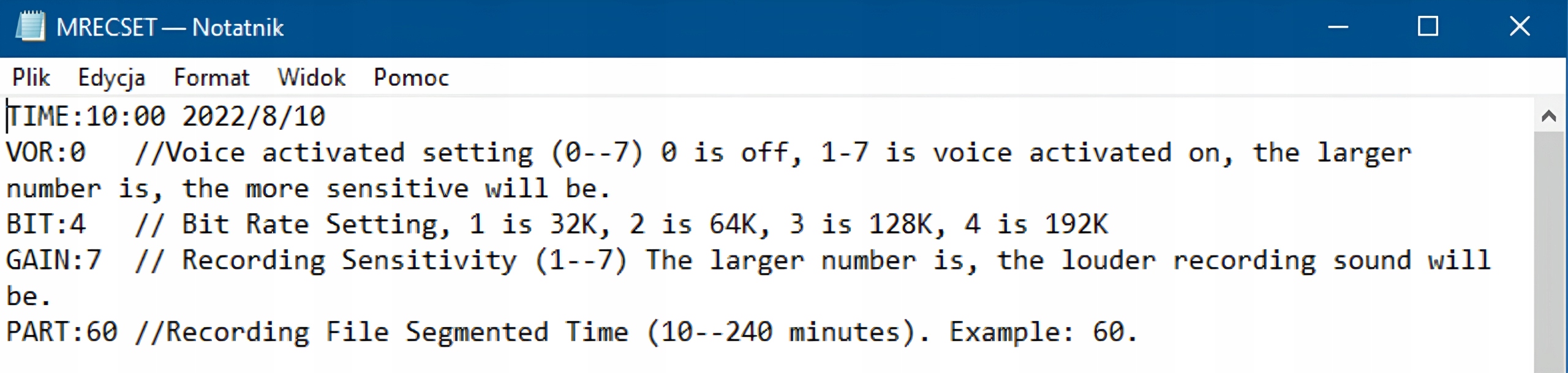 После подключения голосового рекордера к компьютеру в основном каталоге устройства (распознается в виде замены диска), вы найдете файл конфигурации mrecet.txt b>. Именно этот файл позволяет вам вручную адаптировать основные параметры записи к вашим собственным потребностям.