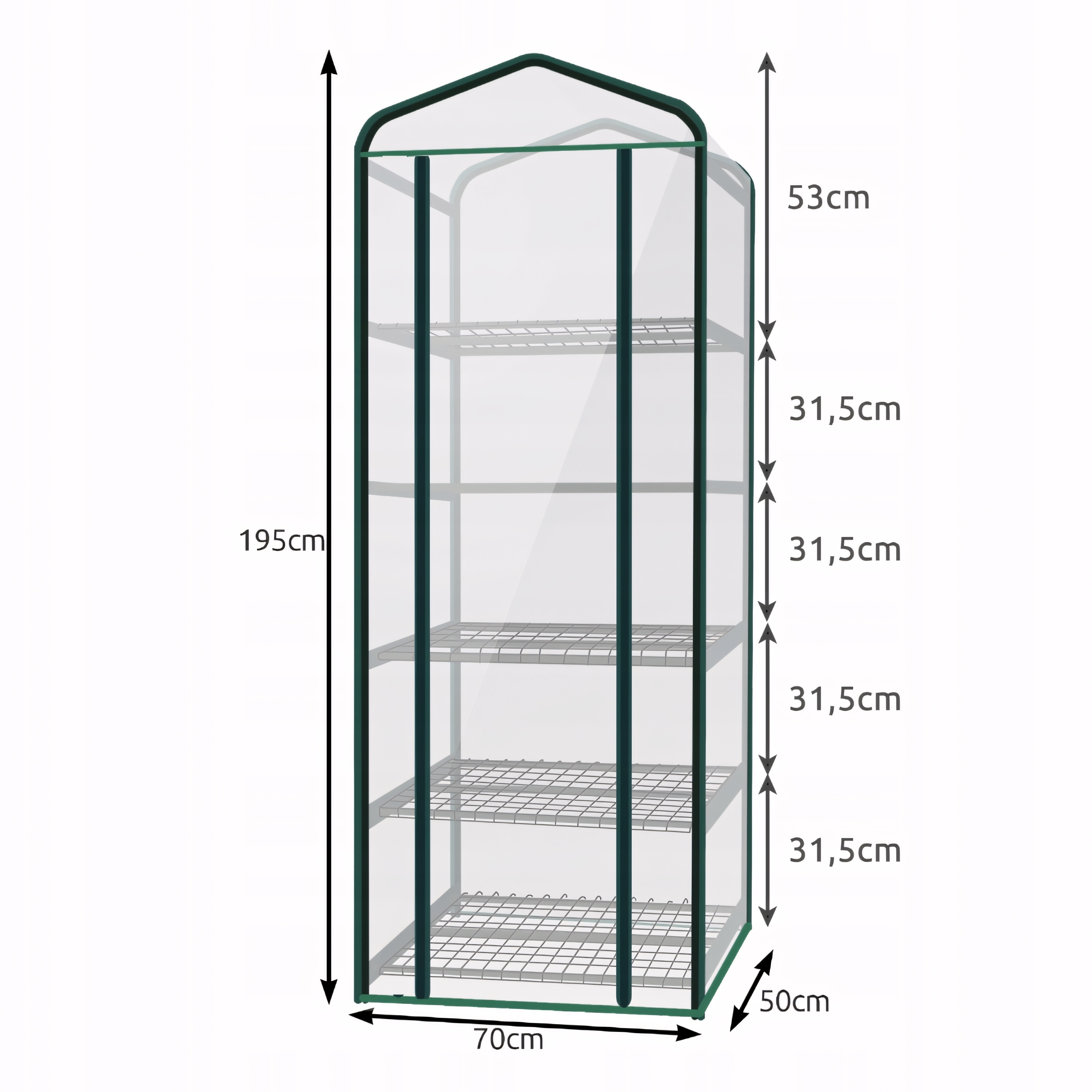 В состав конструкции входят 5 больших полок размером 70 см х 50 см. Они позволяют расположить растения в соответствии с вашими потребностями. Мини-теплица с полками позволяет использовать имеющееся пространство на 100%. Всего на 5 полках в вашем распоряжении целых 1,75 м2.