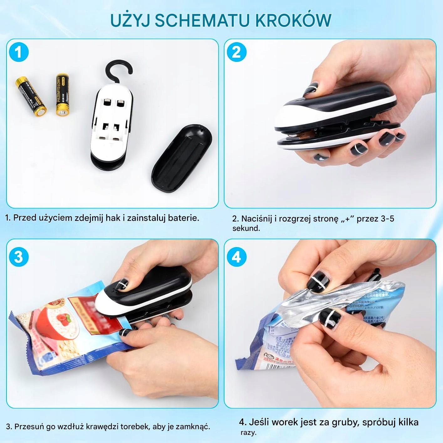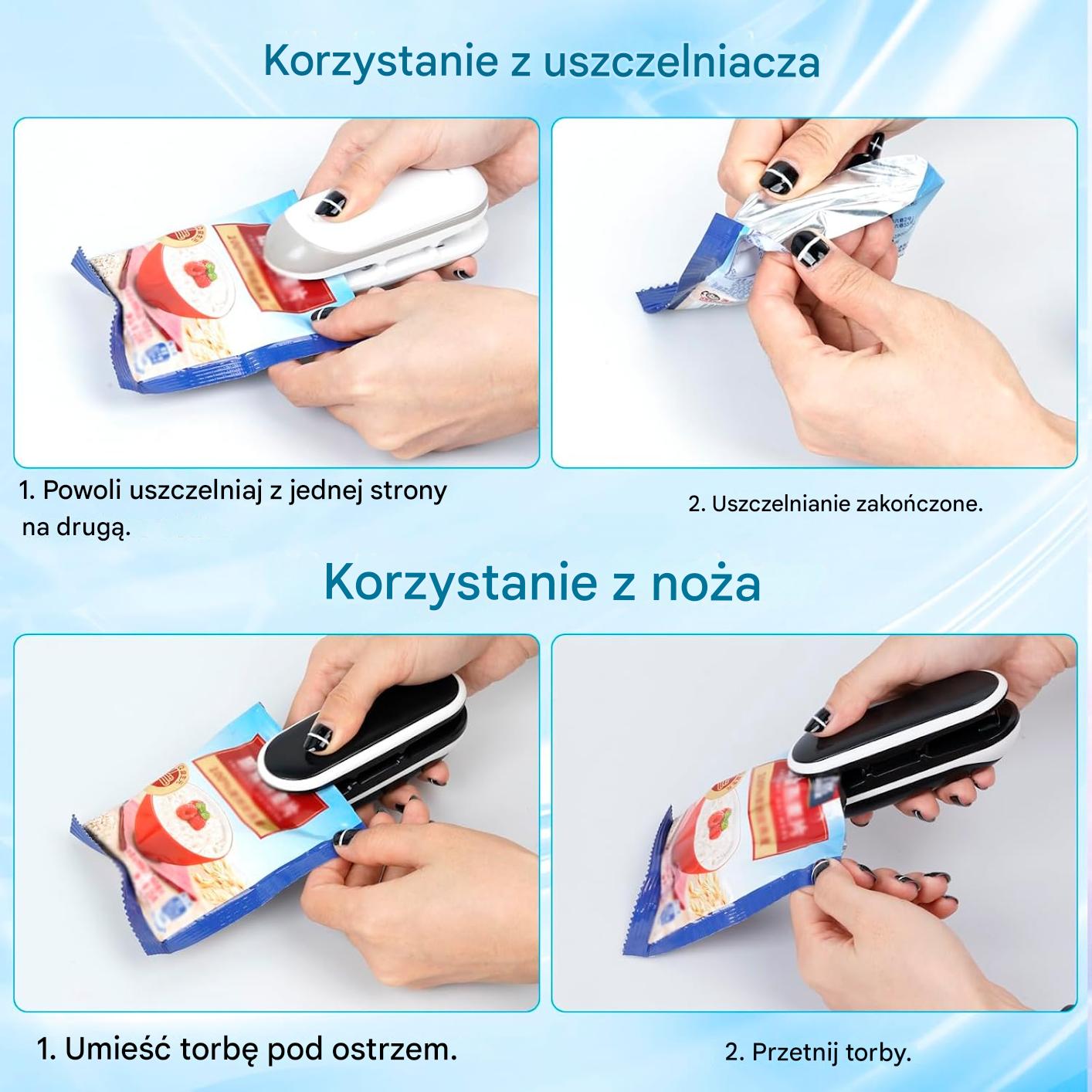 Легко в использовании. Просто нажмите на сварочную машину, перемещая его на пластиковый пакет, который вы хотите запечатать.
