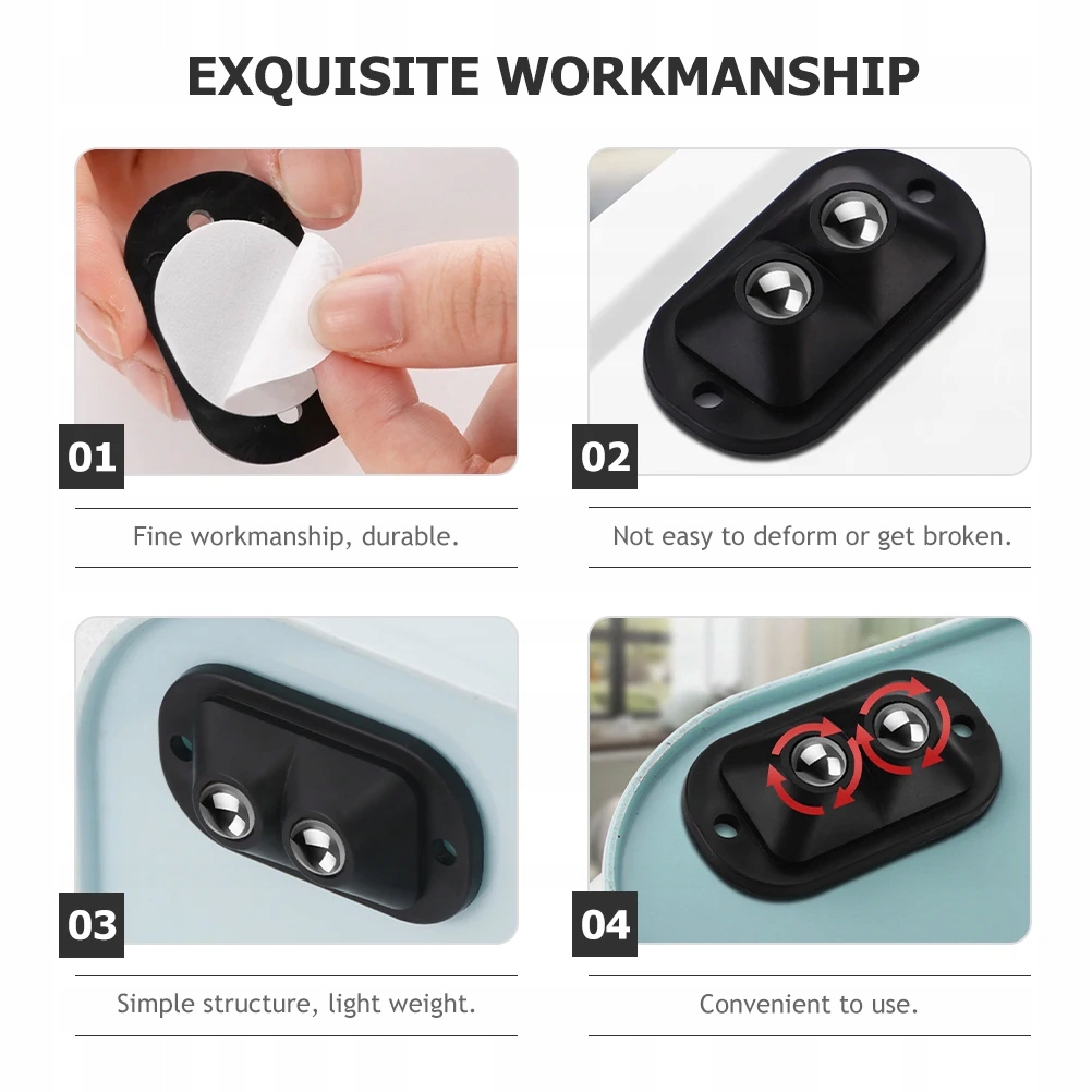 Испытываете ли вы трудности с переноской тяжелых предметов? Тогда вы не сможете пропустить наши роликовые колеса. Эти маленькие колеса, изготовленные из высококачественного материала и тщательно обработанные, их нелегко деформировать или сломать, они долговечны в течение всего времени использования. Самоклеящаяся конструкция прочно приклеивается к коробке и поворачивается под любым углом, что позволяет легко перетаскивать коробки.