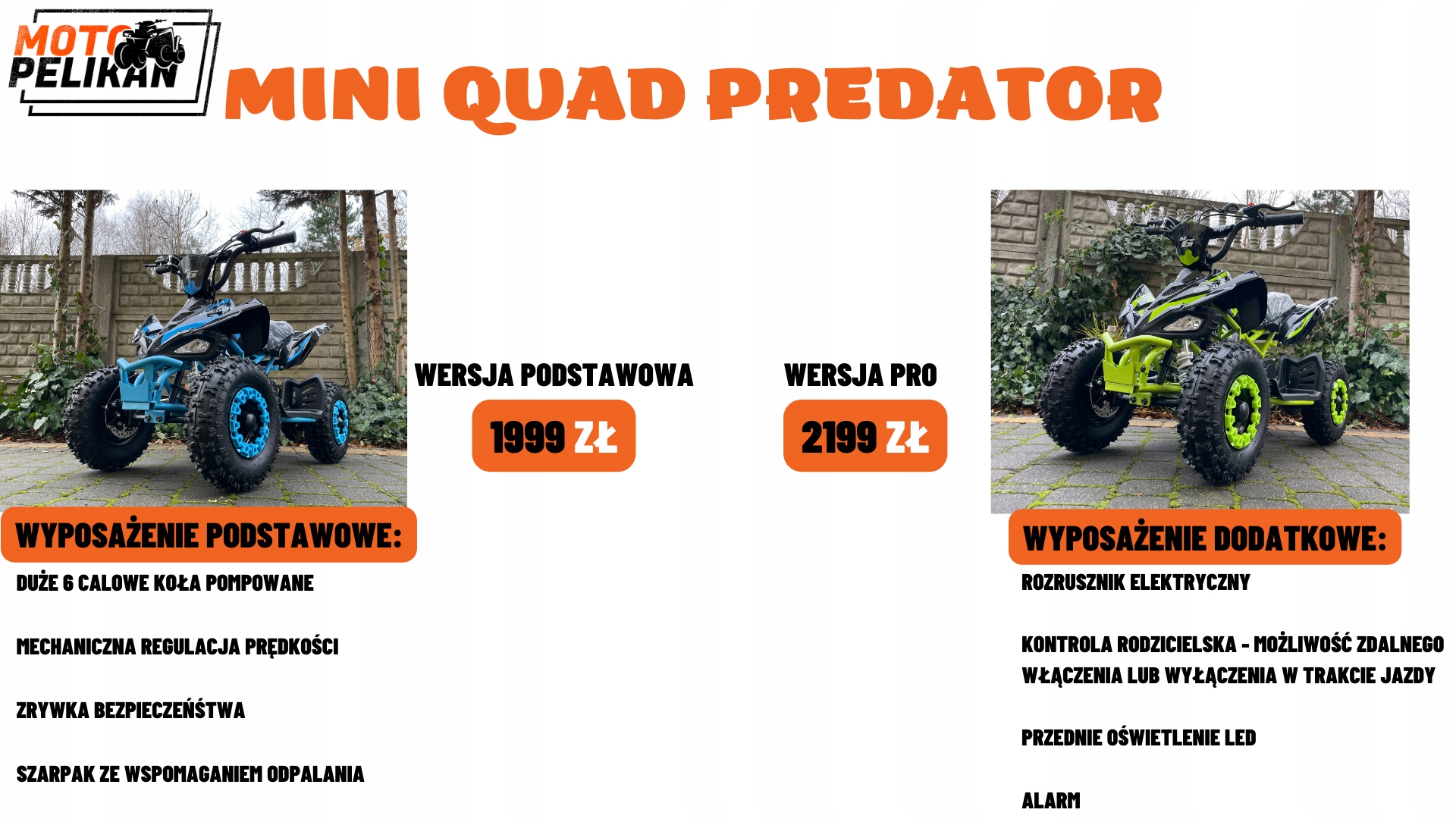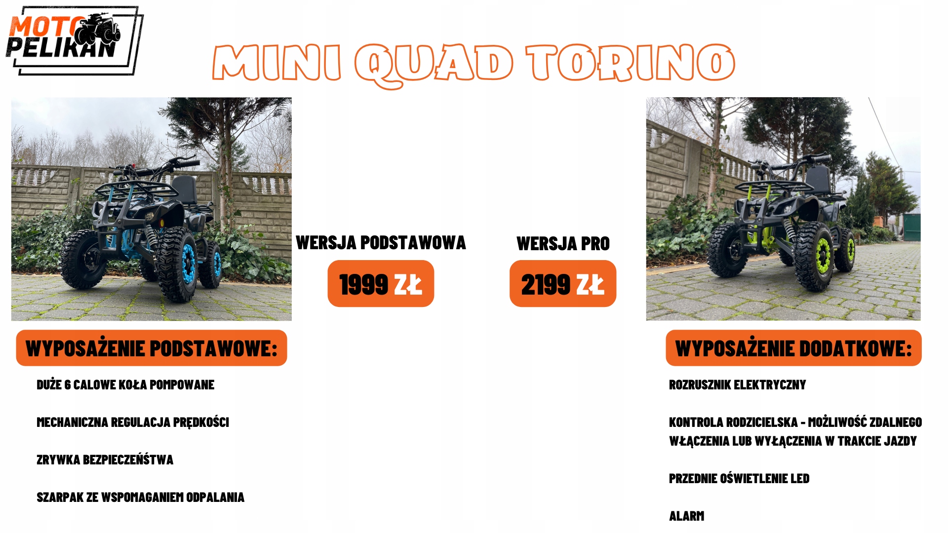 Квадратный хищник или Torino - отличный выбор для детей в возрасте от 3 до 10 лет. Большие 6 -дюймовые насосные колеса позволяют проехать по лесным или полевым дорогам и на других неровных поверхностях. Основная версия , то есть с ручным стартером (буксир с рулевым управлением) и версия Pro , то есть с электрическим стартером. Квадраты в версии E-Start имеют дополнительное светодиодное освещение, пульт дистанционного управления, который позволяет пульту дистанционного управления включать или выключить, даже во время движения