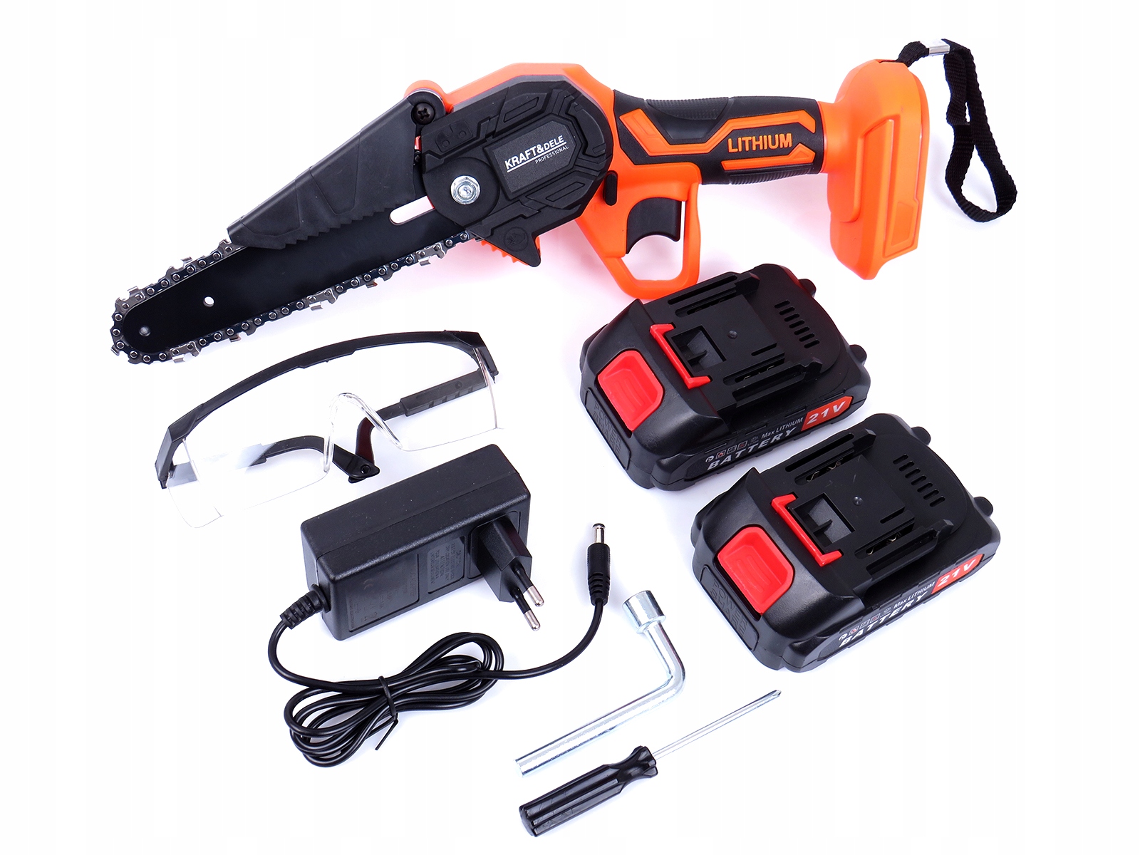 Набор содержит все необходимые элементы для работы, то есть батареи, ключи, необходимые для поддержания пилы, зарядного устройства и даже защитных очков.