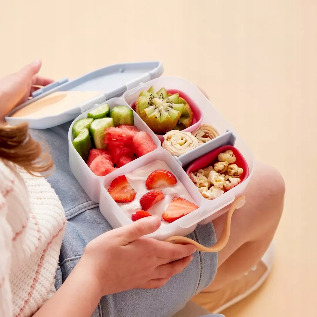 Мини-ланч-бокс для детей b.box имеет два плотных отделения, в том числе одно гибкое отделение для целых фруктов. В эти отделения также можно положить такие закуски, как йогурт, перегной, густое пюре, соус, сочные фрукты и овощи. Рядом с ним расположено отделение без уплотнителя с выдвижным и съемным разделительным элементом, благодаря которому его легче подстроить под свои нужды. Ланчбокс b.box имеет форму удобного чемодана с удобной ручкой и удобным механизмом открывания. защелка для использования.