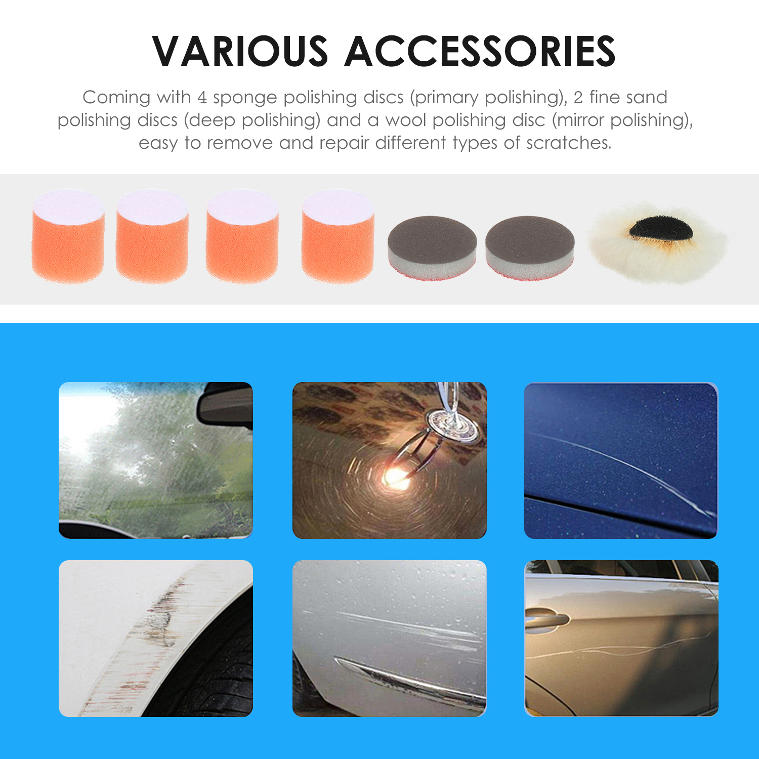 - [Различные аксессуары] В комплект входят 4 губчатых полировальных диска (первичная полировка), 2 полировальных диска с мелким песком (глубокая полировка) и шерстяной полировальный диск (зеркальная полировка), легко удаляются и ремонтируются различные типы царапин.