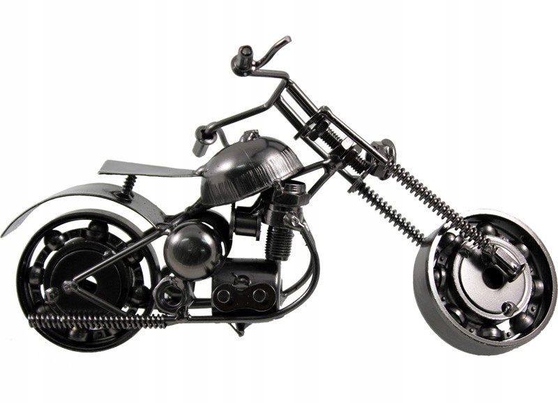 Металлическая фигурка мотоцикла, изготовленная из точно подобранных деталей, в том числе подвижных несущих колес. Колеса вращаются, придавая реалистичность этому прочному индустриальному украшению.