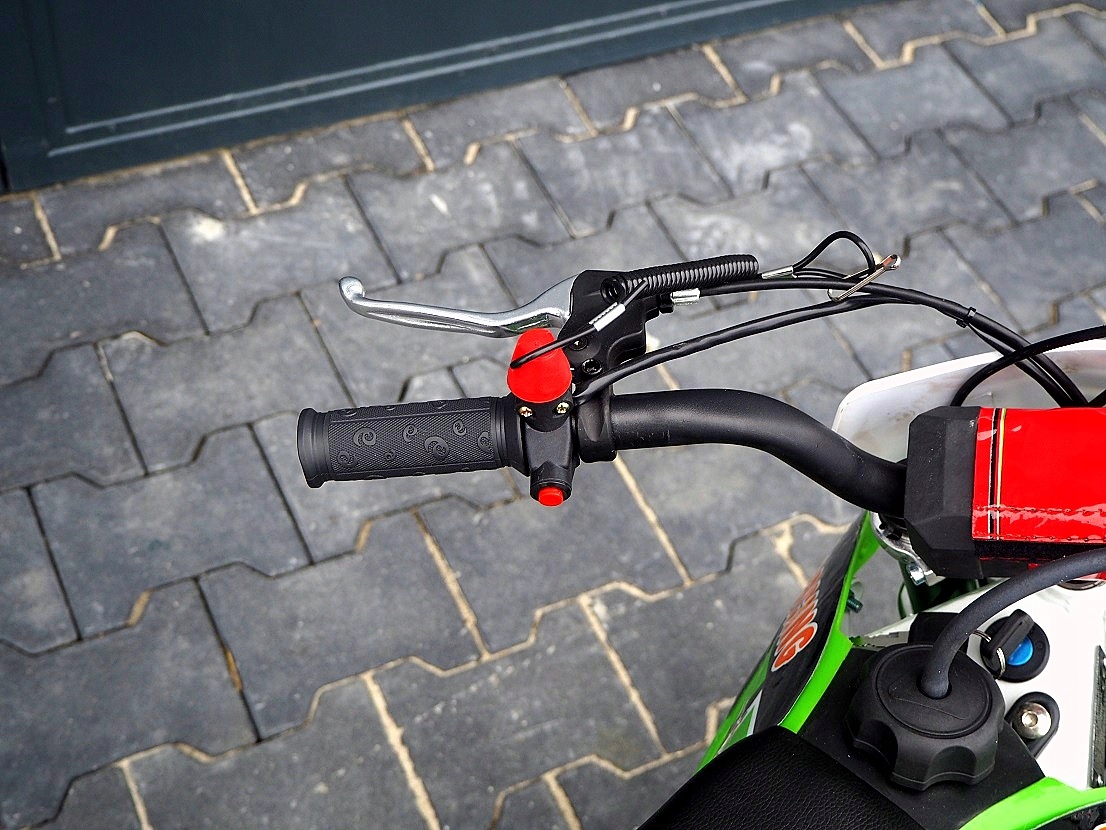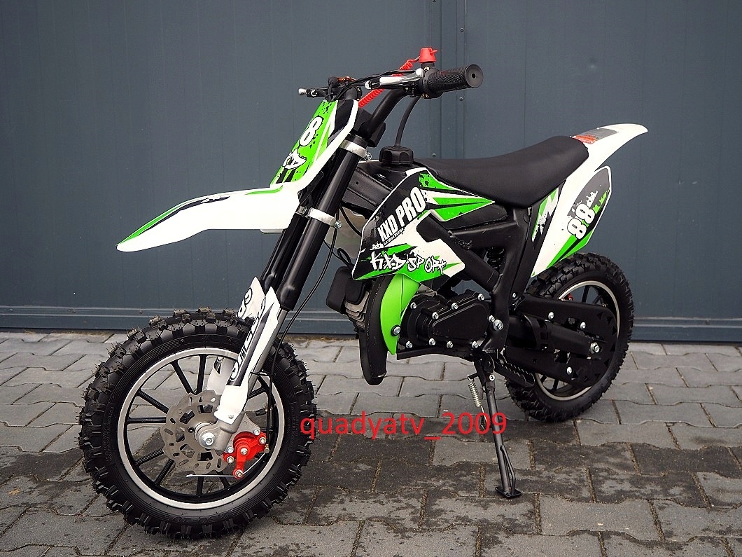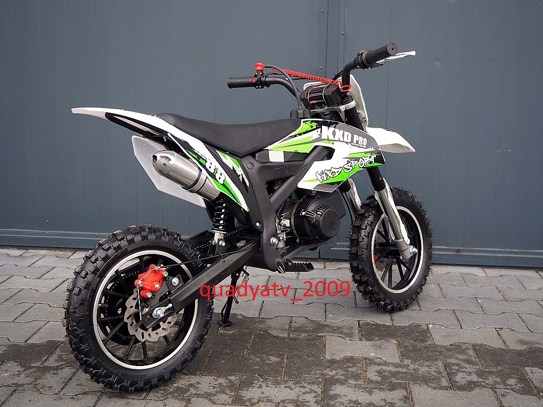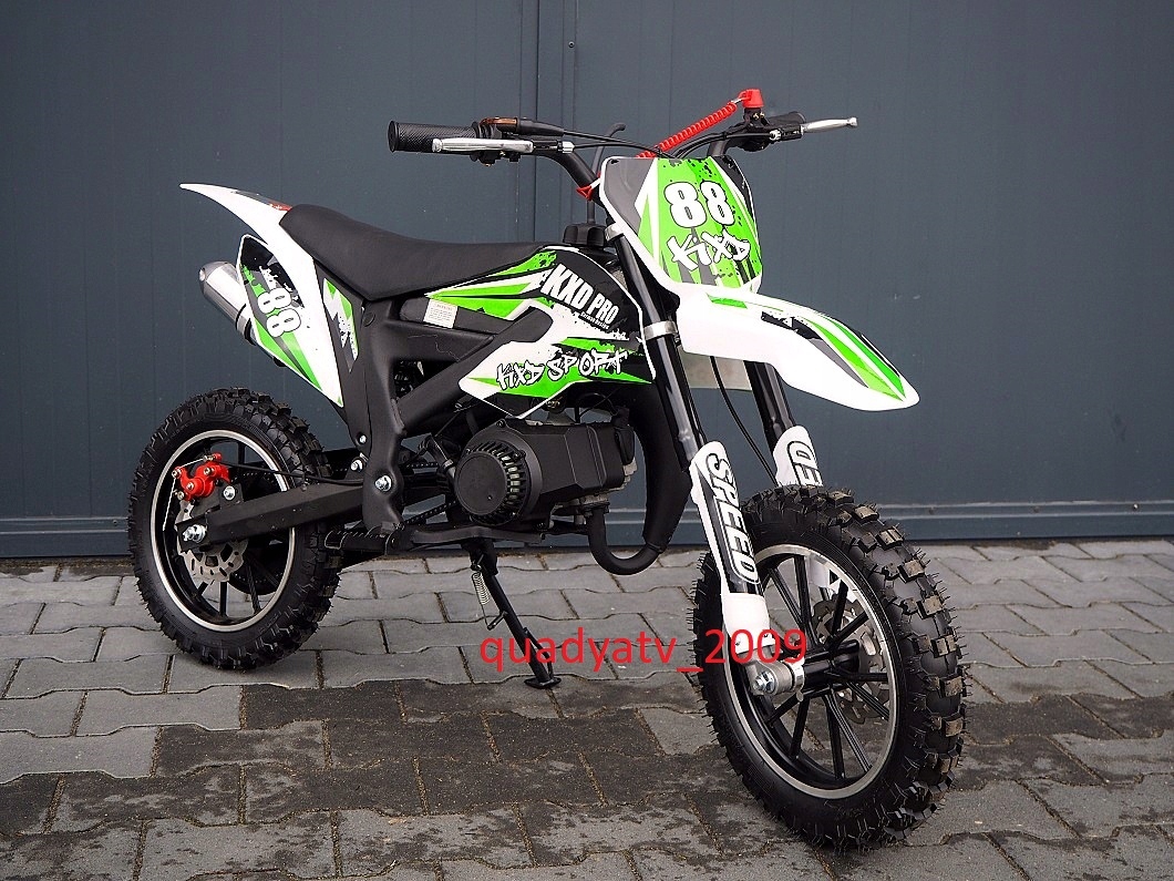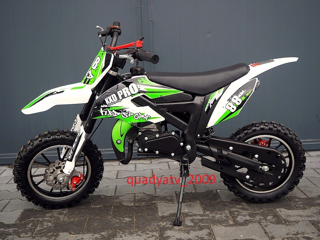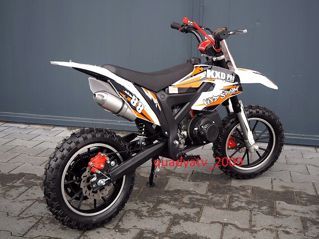 мини -сжигание 50 куб. См, 1 цилиндр, 2 хода, воздухоооооооооооооооооооооооооооовок из. Автоматическая коробка передач, с коробкой передач, 10 -дюймовыми колесами, то есть самым большим из всех двух крестов, защитников, зажигание легкого придурка, что означает очень легкий запуск, дисковые тормоза, как переднюю, так и заднюю, усиленную цепь и подвеску.