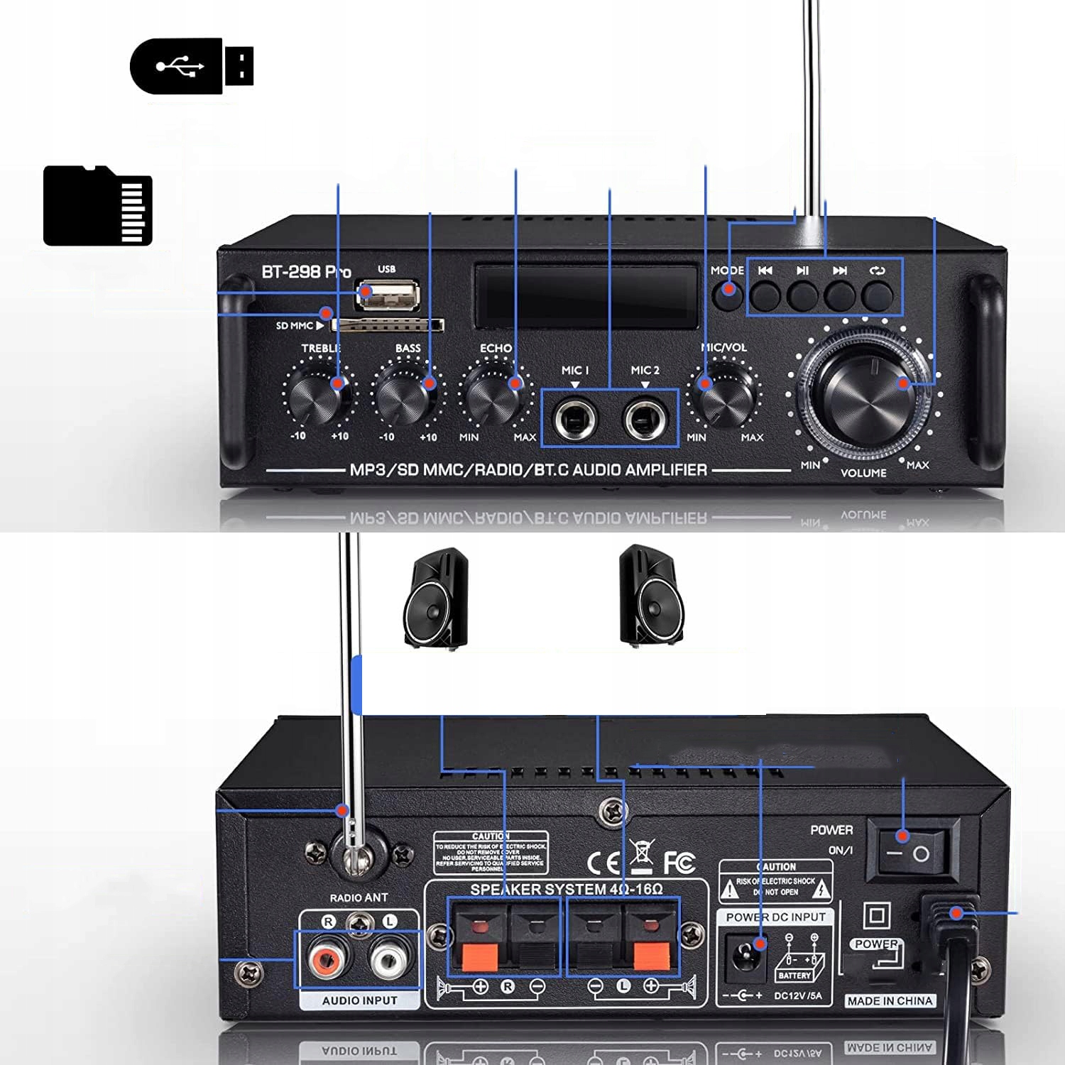 Приемник домашнего аудиоусилителя с входным разъемом для микрофона позволяет петь караоке с семьей или друзьями дома, усилитель с функцией эха обеспечивает более совершенное качество звука HiFi. Кроме того, аудиоусилитель с функцией FM, режим FM позволяет настроить более 20 станций.