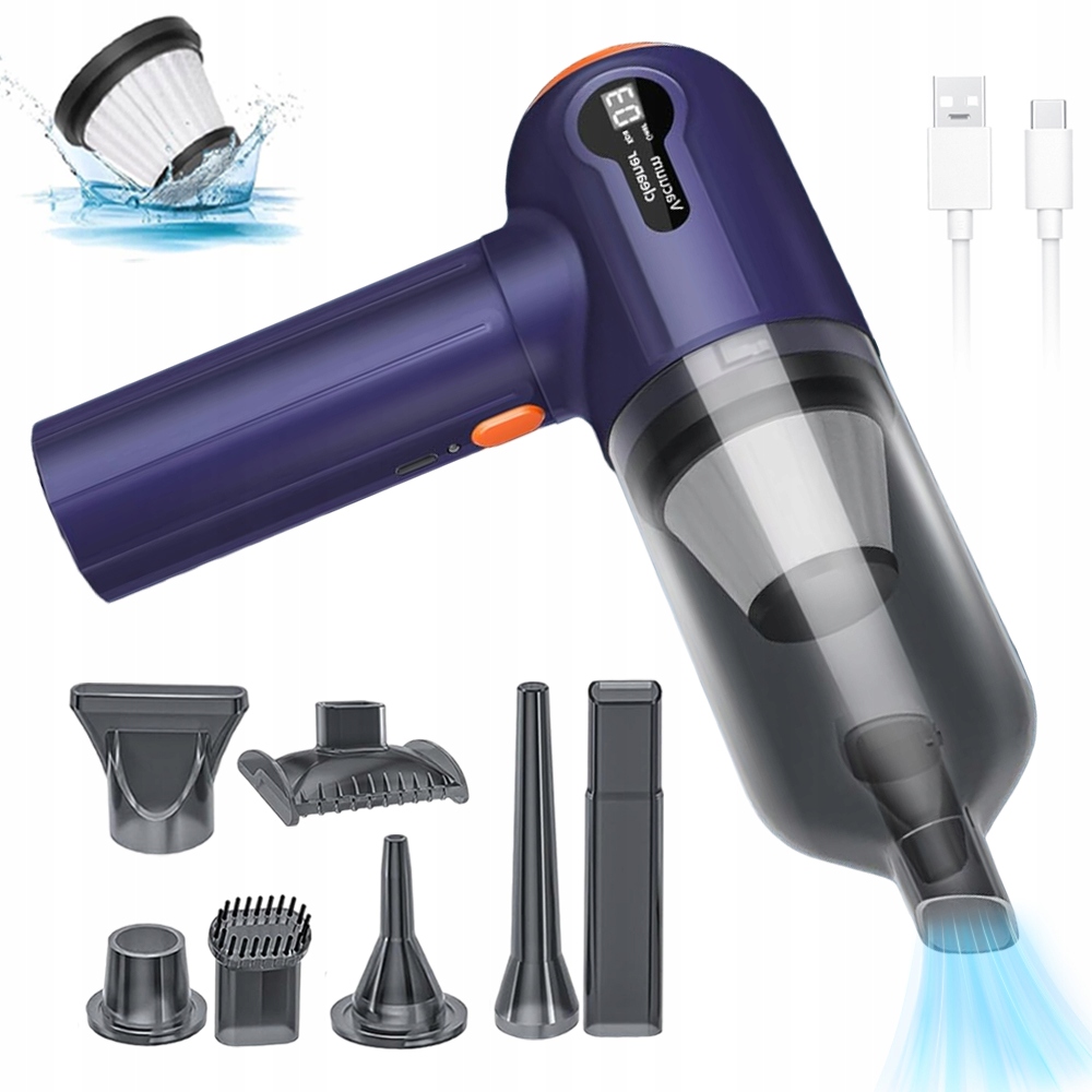 - ☑️Он поставляется с собственным USB-кабелем для зарядки, который можно удобно подключить к USB-порту вашего автомобиля, портативной розетке и другим методам зарядки, что позволяет легко заряжать автомобильный пылесос в любое время и в любом месте.< /ли >