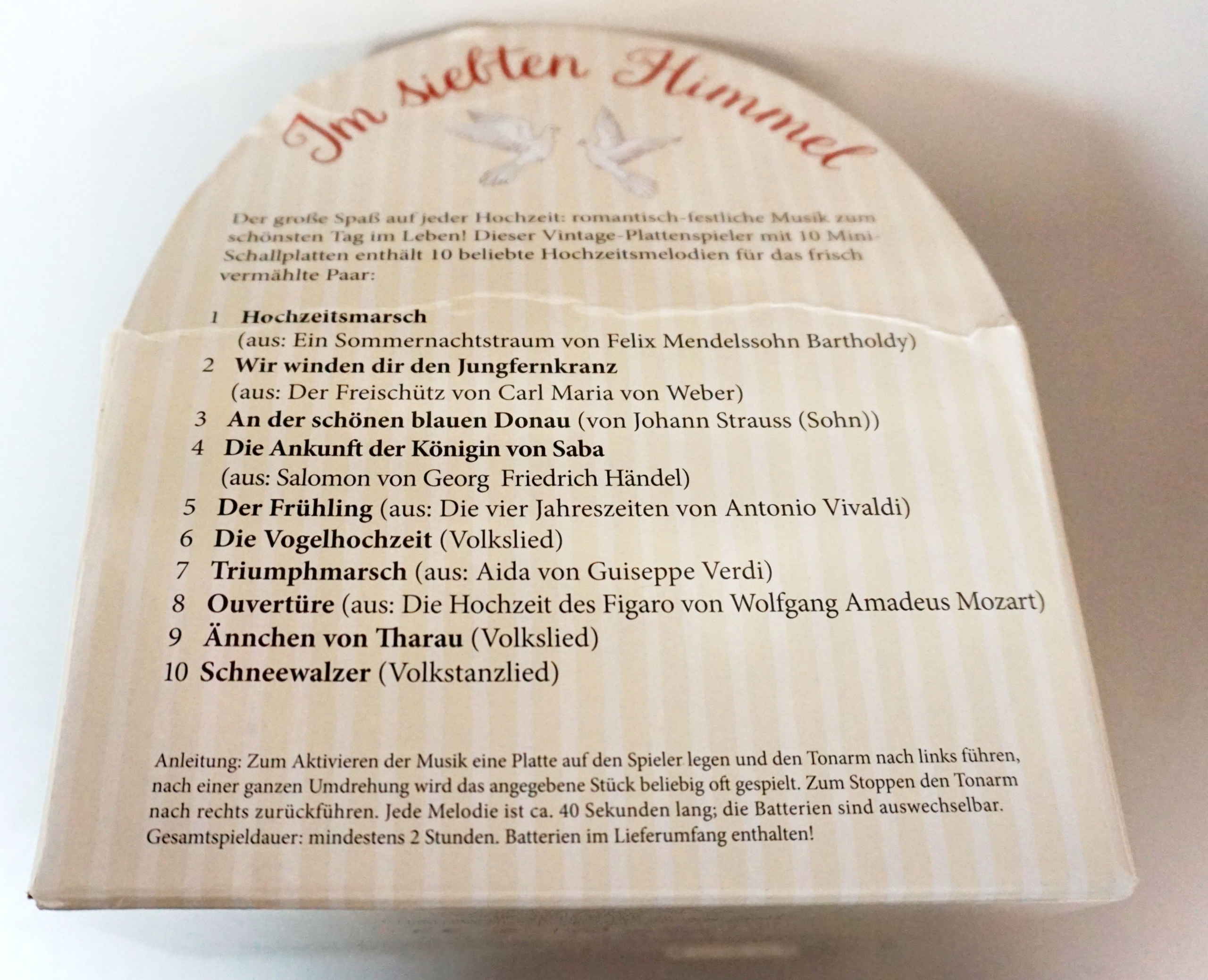 Отличное развлечение в любом месте: романтическая рождественская музыка для самого прекрасного дня в вашей жизни! Этот миниатюрный проигрыватель с 10 мини-пластинками содержит 10 любимых свадебных мелодий жениха и невесты.