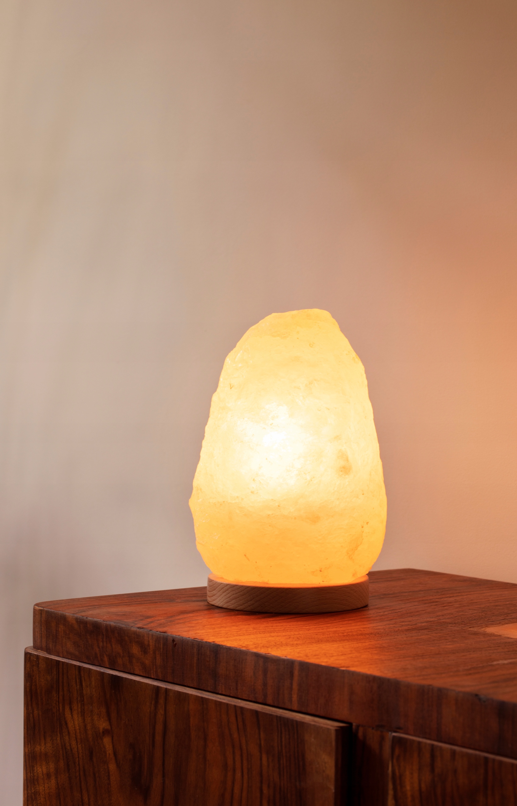 Соляная лампа представляет собой абажур из соляного кристалла естественного уникального оранжевого оттенка, вырезанный вручную и установленный на круглом деревянном основании.