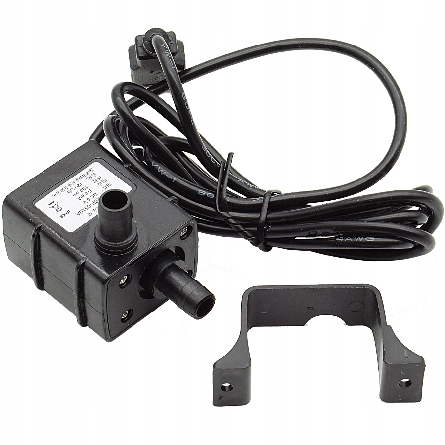 Mini Pumersion Model Model AD20P-0510A в черном, с возможностью потока жидкости до 120 л/ч. Его рабочее напряжение составляет 5 В, а текущее потребление 170 имеет. Он имеет кабель длиной 160 см и USB -заглушка A