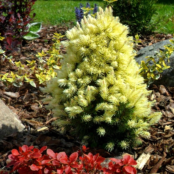 Ель белая «Daisy's White» — сорт популярной б>ель карликовая "Conica", на которую очень похожа по форме. Рост очень медленный. В 10-летнем возрасте он достигает примерно 80 см в высоту. Жесткие побеги, короткая хвоя. Для этого сорта характерны два прироста в год: весенний желто-белый и летний > фисташково-зеленый. Особых требований к почве не имеет.