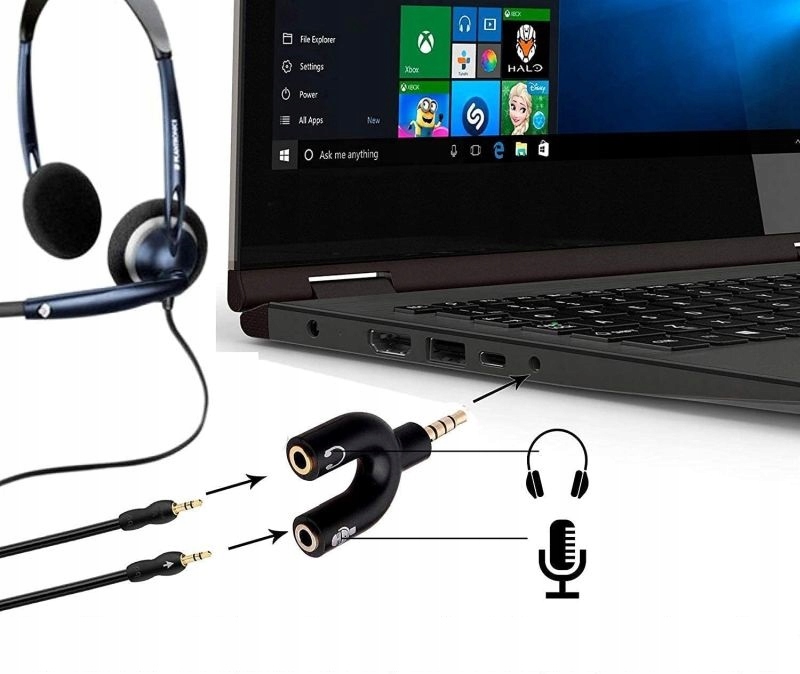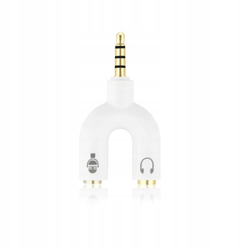 Адаптер высокого качества, который позволяет отделить сигнал от ноутбука, компьютера, консоли и других устройств с интегрированным аудиозметичным сокетом (микрофон и наушники в одном порту) для двух отдельных сокетов. Благодаря этому он позволяет подключать наушники или динамики и микрофон отдельно к одному мини -джак -розетку 3,5 мм, например, в ноутбуке. Соперники были помечены с изображениями