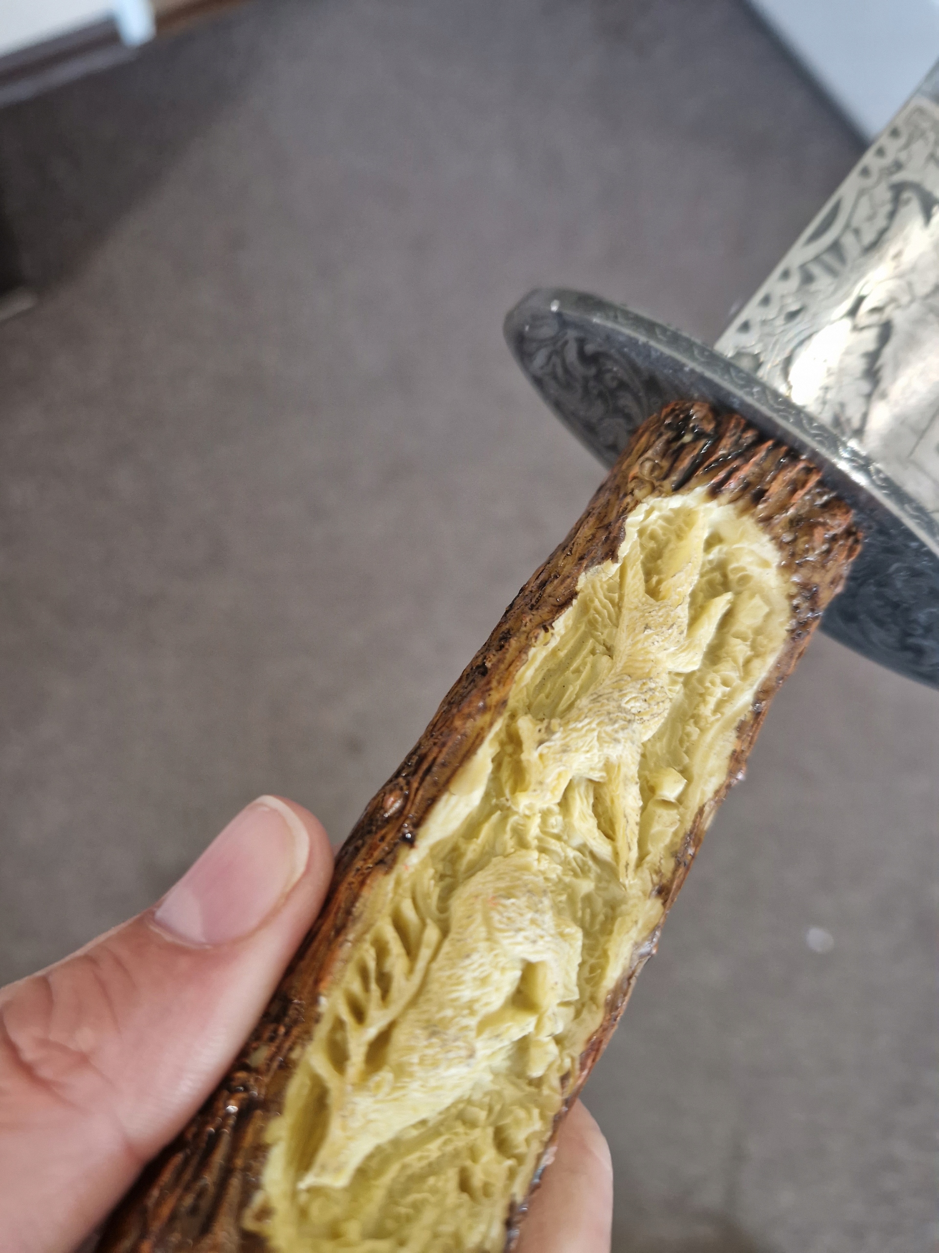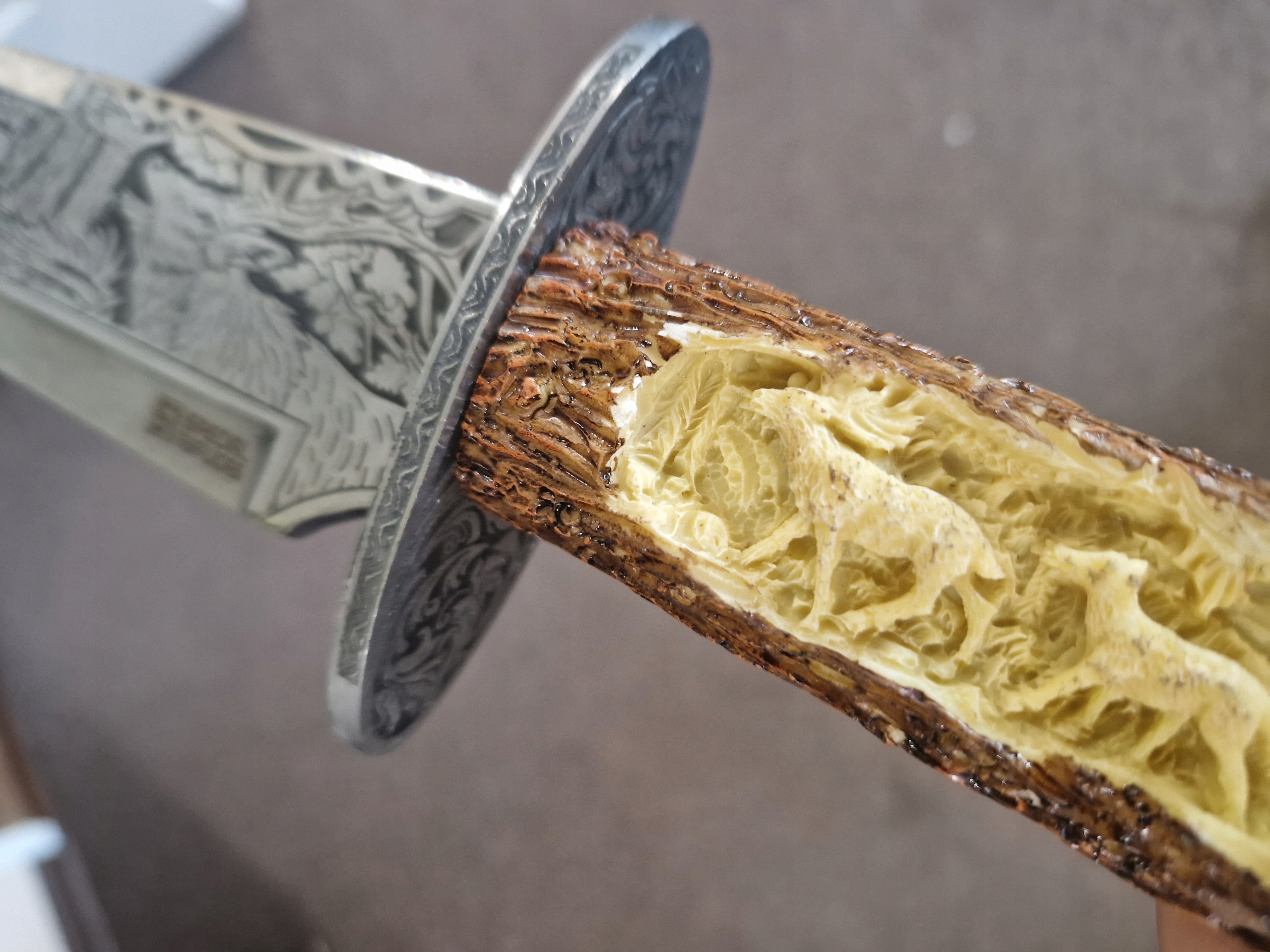 ❇ из нержавеющей стали высшего качества, этот угол не только красивый, но и практичен. Общая длина 38 см делает его впечатляющим, и ручка имитационных рога добавляет подлинности. graved blade украшен цветочными и животными мотивами, а венчение ручки с головой оленя подчеркивает уникальный характер этой работы. Все опирается на достойный имитационный стенд рога, который не только практичен, но и является неотъемлемой частью композиции.