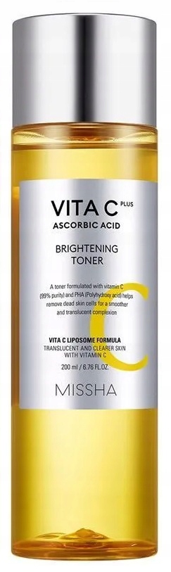 VITA C Plus - Brightening Toner от Missha. Тоник для лица. Предназначен для ежедневного ухода за зрелой, матовой, обесцвеченной и неровной кожей. Его действие основано на специально подобранных активных ингредиентах, таких как: ниацинамид, трегалоза, витамин С, экстракт корня солодки, пантенол, церамиды, пептиды и продукт ферментации молочнокислых бактерий. Косметическое средство увлажняет, освежает и успокаивает раздражения. При регулярном использовании выравнивает цвет, уменьшает обесцвечивание и покраснения. Дополнительно замедляет процесс старения эпидермиса, регулирует работу сальных желез, уменьшает мелкие морщины. Он обладает сильным антиоксидантным и противовоспалительным действием. Он доступен в объёме 200 мл.