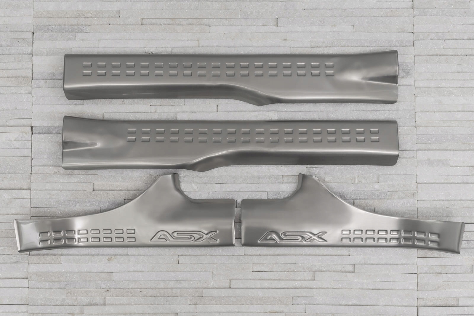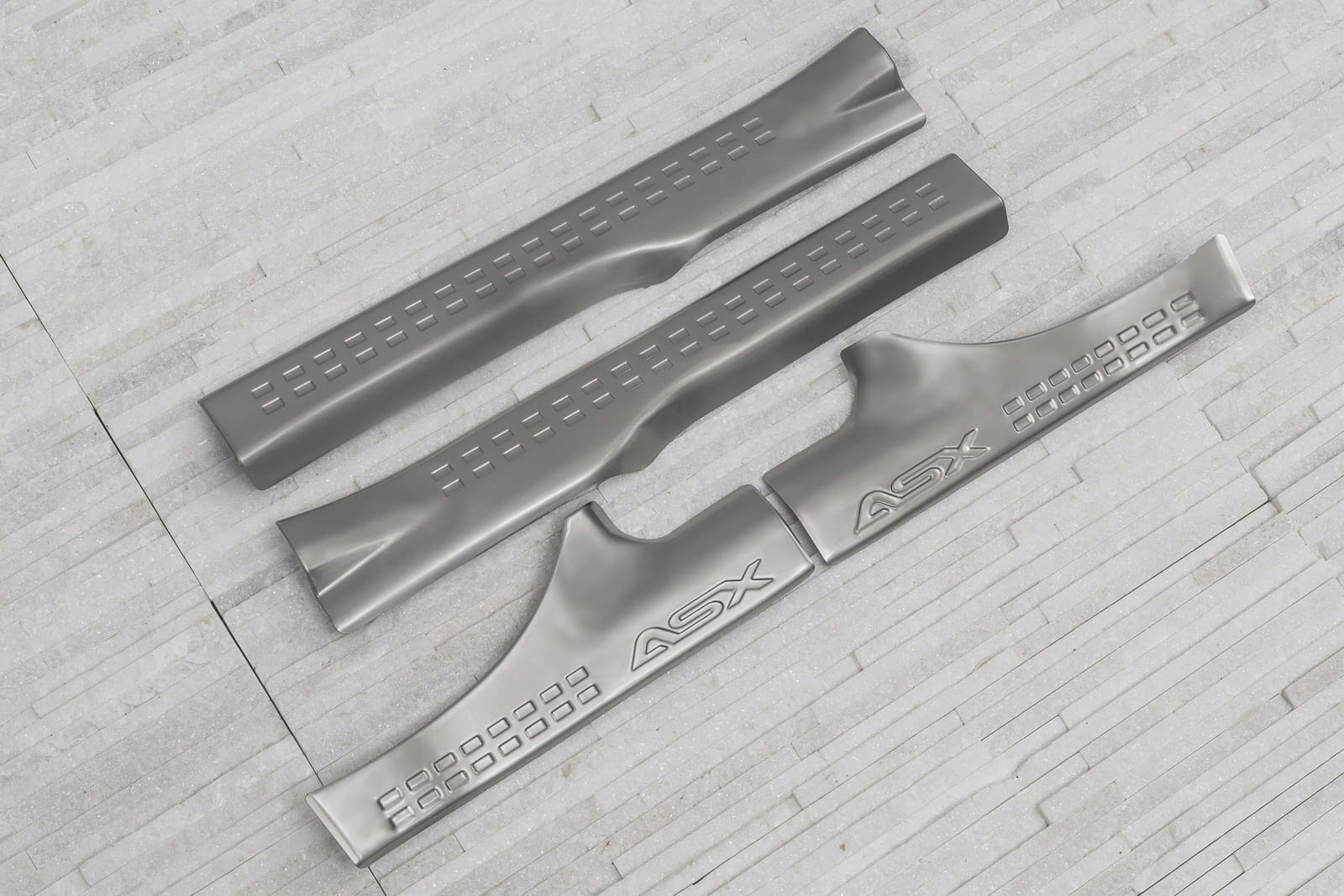 Полоски крепятся на верхние, пластиковые части внутренних порогов. Они дополняют внутреннюю линию двери и придают зоне подоконника спортивный и элегантный вид. Данная модель привлекает внимание декоративными панелями с надписью ASX, украшающими каждую полоску.