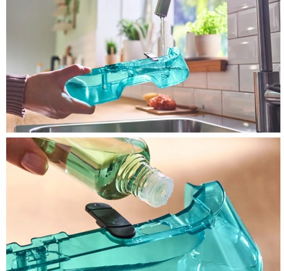 Одно заполнение контейнера позволяет выполнять множество операций по уборке. Емкость для воды в крышке DynamicAqua 2в1 является съемной, поэтому вы можете легко отсоединить ее и наполнить пресной водой прямо из-под крана. Его емкость составляет 250 мл, чего достаточно для мытья площади до 50 кв.м. поверхность. Для достижения еще более гигиеничных результатов уборки можно добавить в емкость несколько капель подходящего средства для мытья полов.