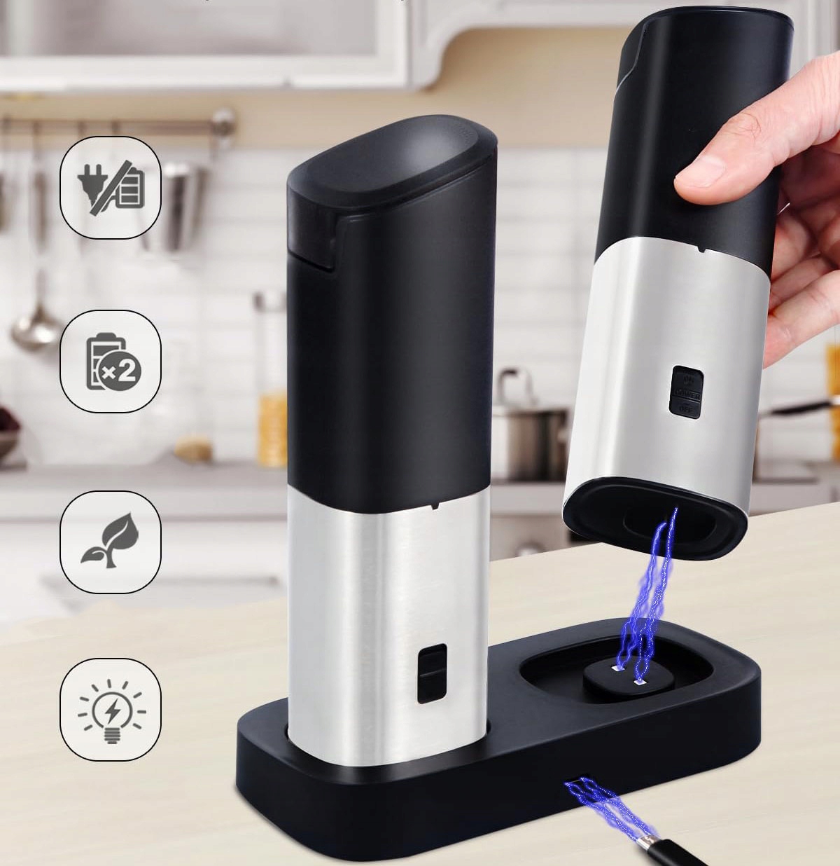 МЛИН ДЛЯ ПЕРЦЮ І СІЛІ ЕЛЕКТРИЧНИЙ, АВТОМАТИЧНИЙ ПОМЕЛ ЗІ LED, 2 ШТ.