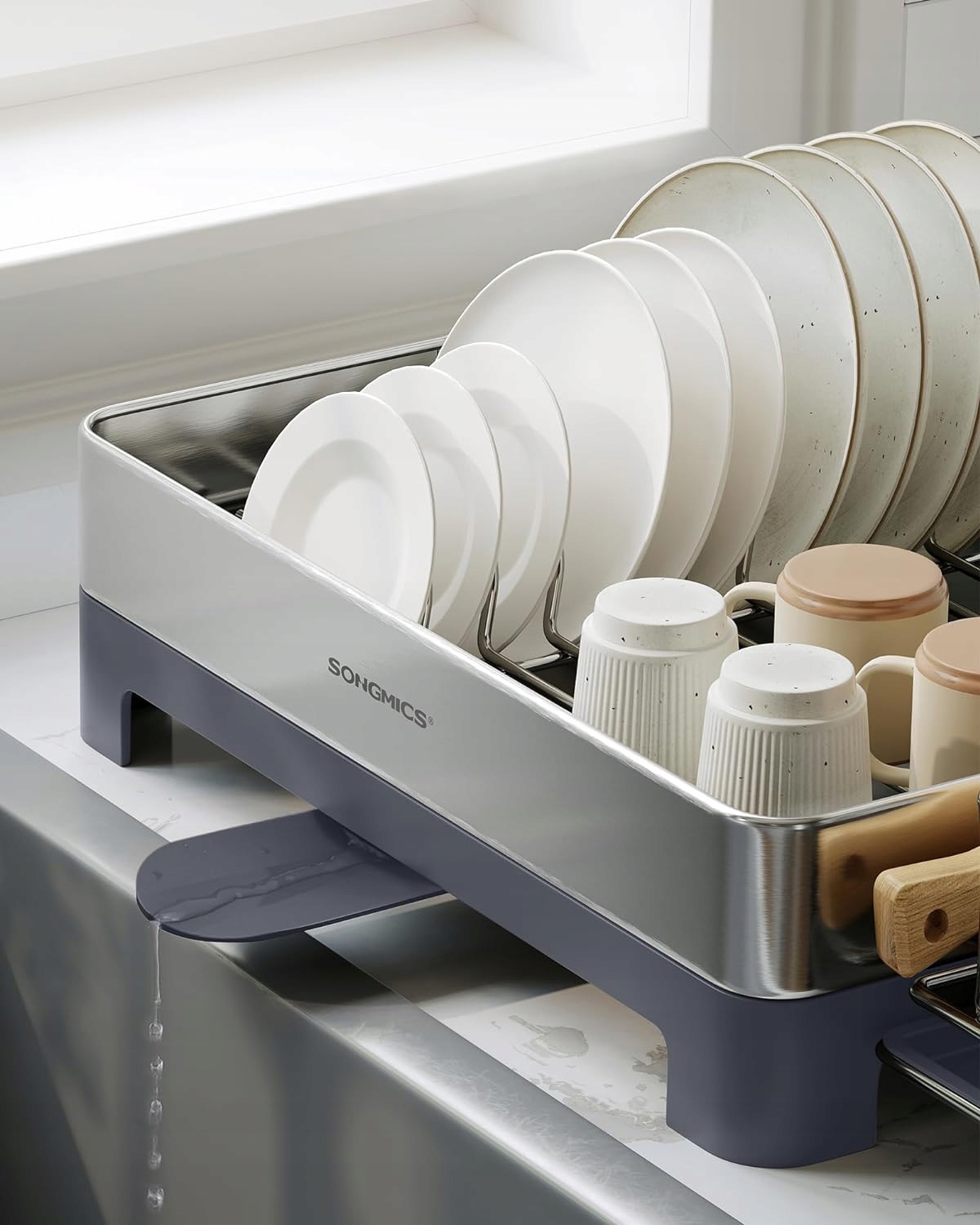Сушилка имеет специальные места для тарелок, столовых приборов, чашек, разделочной доски и другой посуды. Расстояние между планками-держателями тарелок составляет 2,6 см, поэтому туда поместится как меньшая, так и большая посуда.