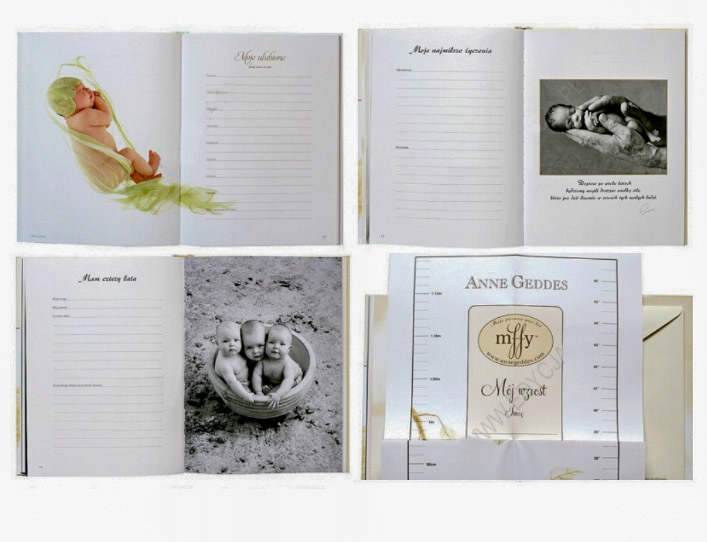 К каждому альбому прилагается большой конверт, в котором можно разместить диск с УЗИ, свидетельство о рождении и другие ценные сувениры. Вы также можете найти настенный измеритель с фотографиями Анны Геддес, чтобы вы могли следить за ростом вашего ребенка.