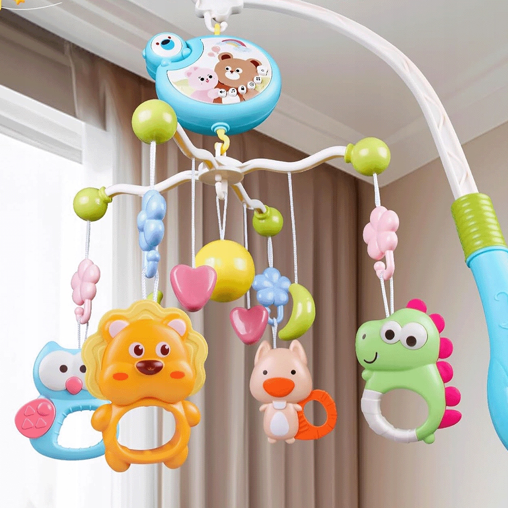 Карусель с музыкой и проектором: она не только воспроизводит успокаивающие мелодии (например, «Звуки дождя» или «На прекрасном голубом Дунае»), но и проецирует волшебные изображения животных на потолок или стену! 🦁🦉🦊