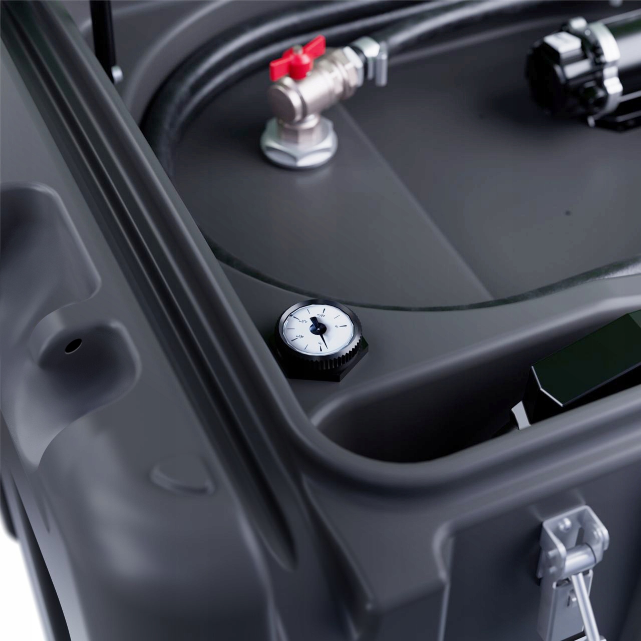 Предотвращает выливание жидкости во время транспортировки, повышает безопасность использования, а закрывающиеся защелки обеспечивают ограниченный доступ к баку.
