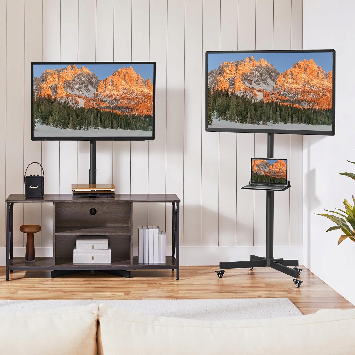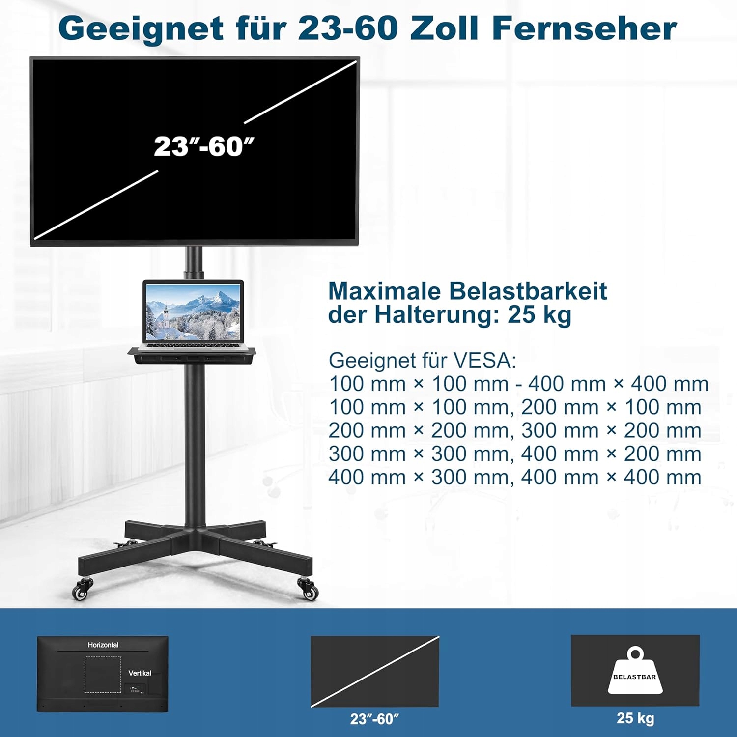 - Эта подставка для телевизора стоит на Х-образном основании с четырьмя колесами. Четыре колеса с тормозами позволяют использовать его на презентациях, вечеринках и реорганизации помещения.