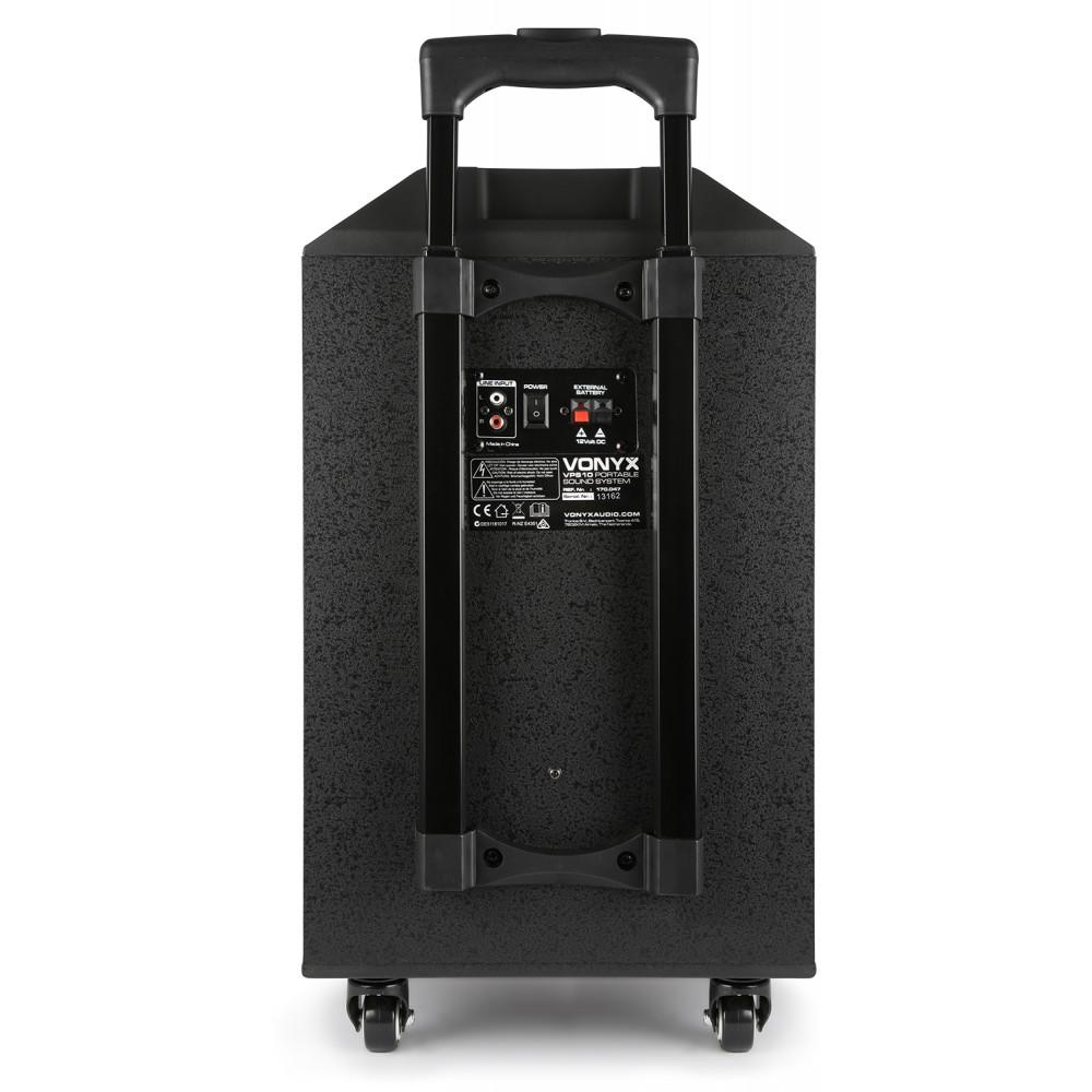 Мобильный аудиоустройство. Он имеет усилитель 250 Вт и встроенный MP3 -файл из портов USB/SD, и благодаря функции Bluetooth можно воспроизвести музыку прямо с телефона. На верхней панели устройства вы найдете прозрачный дисплей и возможность редактировать уровень громкости, баса или высоких частот. Набор включает в себя микрофон UHF. Телескопическая ручка и колеса были установлены для удобного и простого транспорта