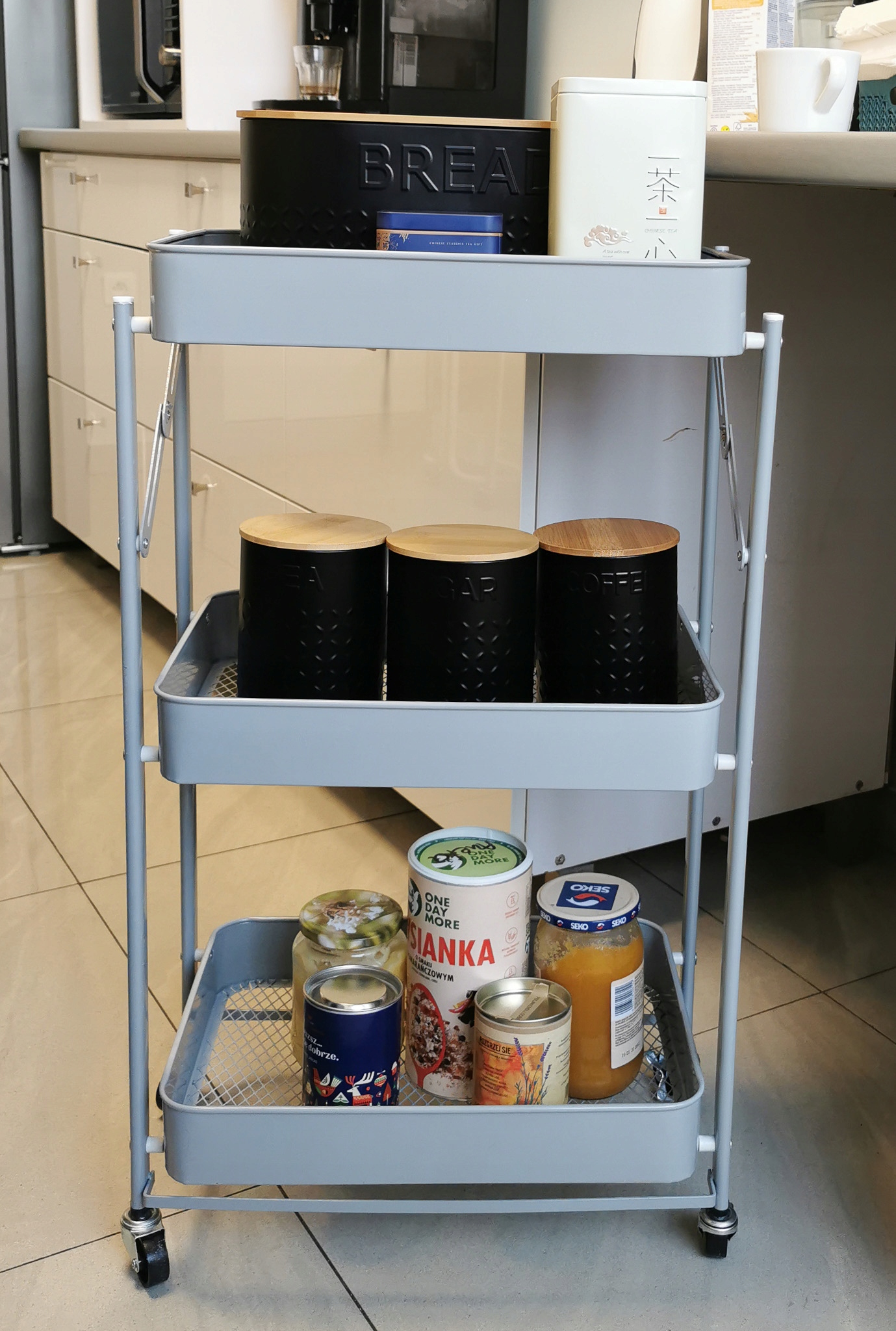 MOBILNY REGAŁ SKŁADANY 3 PÓŁKI KUCHENNY ŁAZIENKOWY NA KÓŁKACH WÓZEK SZARY