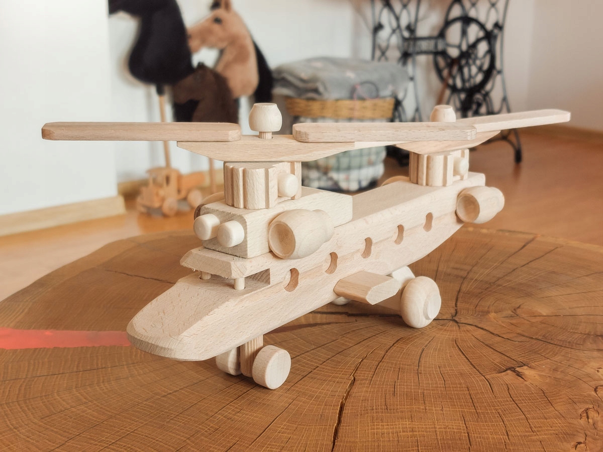 Модель ручной работы из массива дерева, стилизованная под вертолет Boeing CH-47 Chinook.