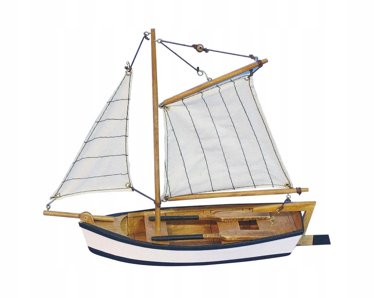 Детальная деревянная копия лодки с сине-белым корпусом и полосатыми парусами, длиной 25 см и высотой 23 см.