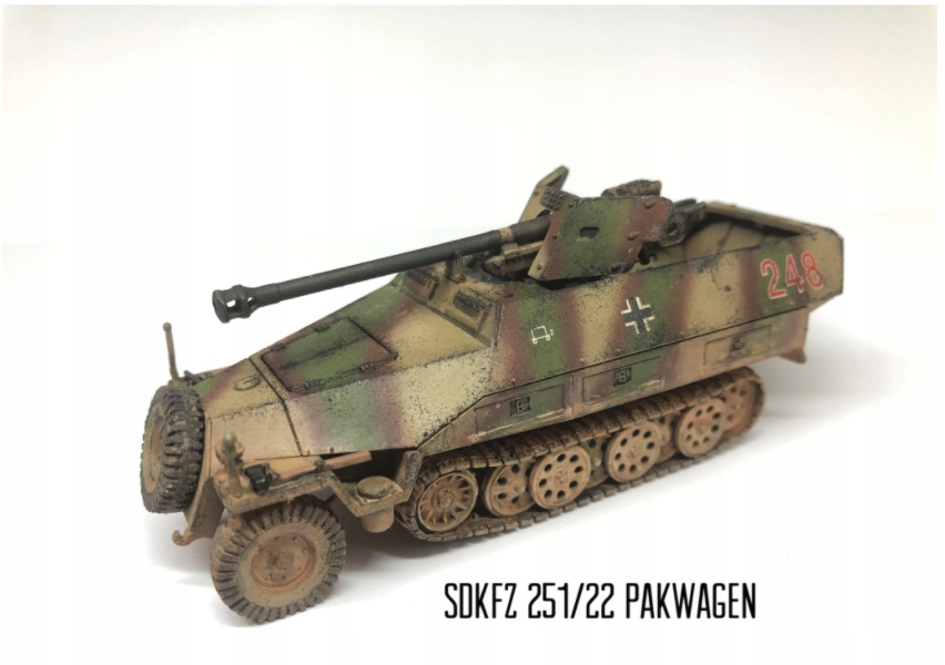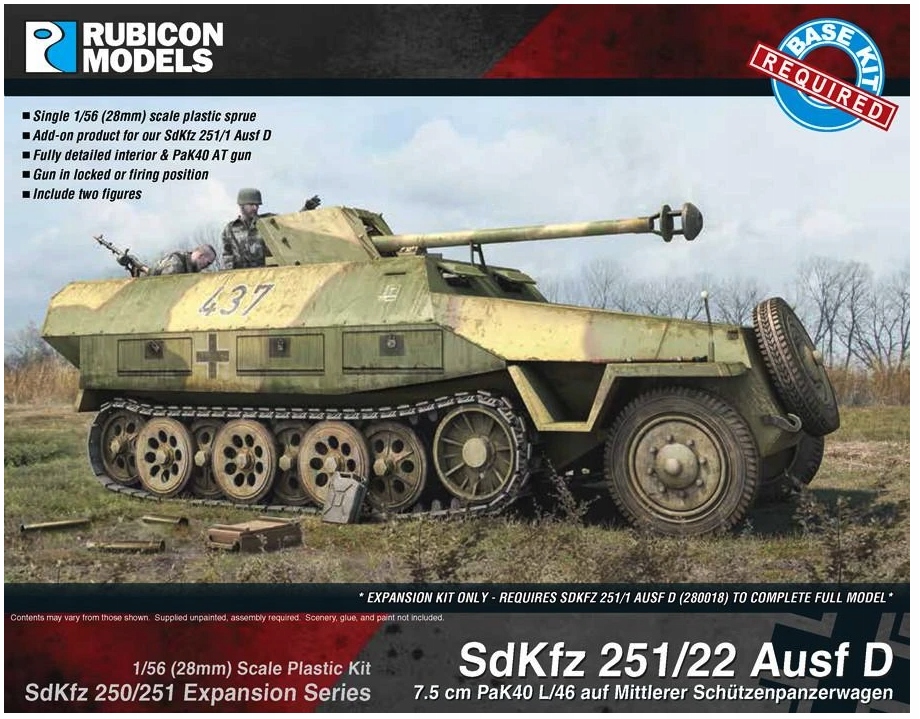 <р> SdKfz 251/22 (на базе SdKfz 251/1), называемый просто «Pakwagen», был одной из лучших машин поддержки ПТ, оснащенной высокоскоростными орудиями PaK 40 L/46 или L/48. Они широко использовались по мере перехода операций в оборонительные — от Италии до Нормандии и Восточного фронта. Дальность действия орудия позволяла машине находиться в относительной безопасности с хорошо замаскированных и заранее установленных позиций. Однако шасси никогда не было рассчитано на дополнительный вес, удары и отдачу, что приводило к многочисленным механическим поломкам и чрезмерной усталости конструкции. Тем не менее 44 декабря Гитлер придал этой версии высший приоритет. Рукоять представляла собой две Н-образные балки, приваренные к полу, в середине кормовой части отсека. Щит был модифицирован с обрезанными углами, а платформа была сделана из плоских треугольных пластин, удерживающих исходную люльку на месте. Водитель сидел с левой стороны, целясь в штатную оптику PaK 40. Вращение составляло 18° и 19°, а высота - от -3° до +22°. Записано 22 патрона (HE и AP). Обычно экипажи несли дополнительные ракеты в незакрепленных контейнерах, хранившихся там, где это было возможно. Данные о производстве неуловимы: около 1200 машин на шасси Ausf D. <р> <р> ТОЛЬКО НАБОР РАСШИРЕНИЙ <р> Для сборки полной модели требуется SdKfz 251/1 Ausf D (280018). <р> <р> Особенности продукта: <р> - Дополнительный товар для нашего SdKfz 251/1 Ausf D (280018) <р> - Полностью детализированный интерьер и пушка PaK40 AT. <р> - Пистолет в запертом или боевом положении <р> - В комплекте две фигурки - заряжающий и офицер <р> Код товара: 280041 <р> 29 шт./1 настойRubicon models — британская компания, производящая исторические модели и фигурки, в том числе времен Второй мировой войны.