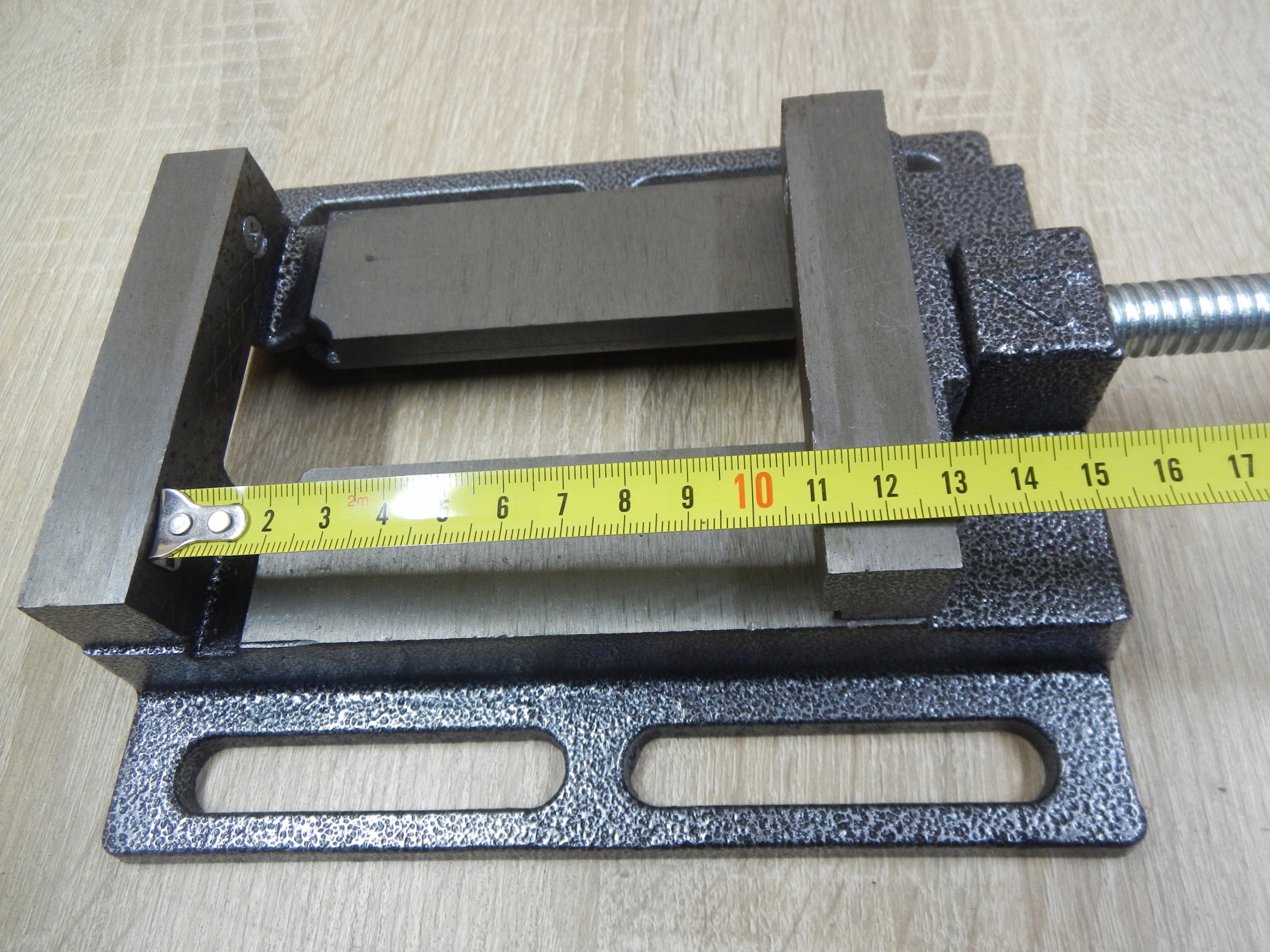 Тиски для сверления с рифленым основанием, обеспечивающие легкую установку и позиционирование тисков. Изготовлен из литой стали, с прочными стальными губками с поперечными насечками.