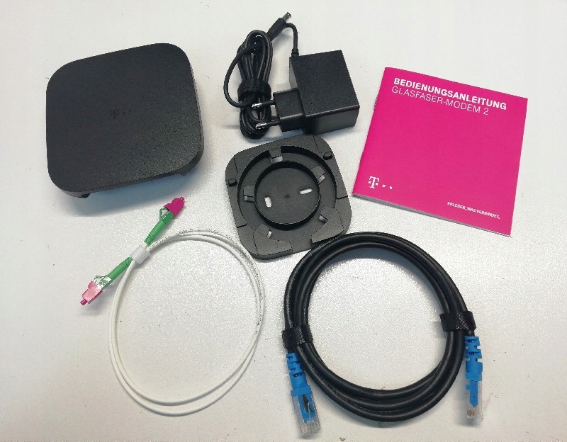 В комплект входит модем, настенное крепление, блок питания, оптический кабель, LAN-кабель и инструкция на немецком языке.
