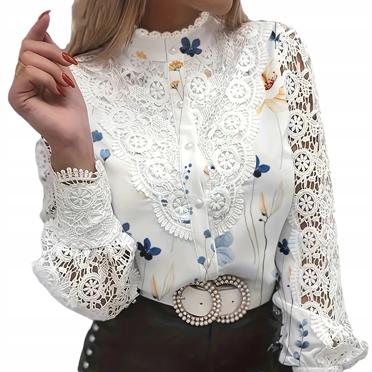 МОДНА ЖІНОЧА БЛУЗКА, ЕЛЕГАНТНА МЕРЕЖИВНА СОРОЧКА З КВІТАМИ, ГУДЗИКИ, ДЕКОРИРОВАНА