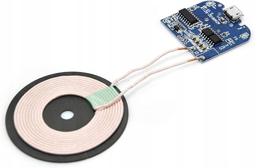 Модуль беспроводного индуктивного зарядного устройства QI, состоящий из печатной платы с электронной схемой и катушкой, используемой для передачи эклектической энергии на приемник, оснащенный функцией QI. Модуль оснащен стандартным разъемом microUSB для подачи напряжения 5В (так же, как в телефонах и т.п.).