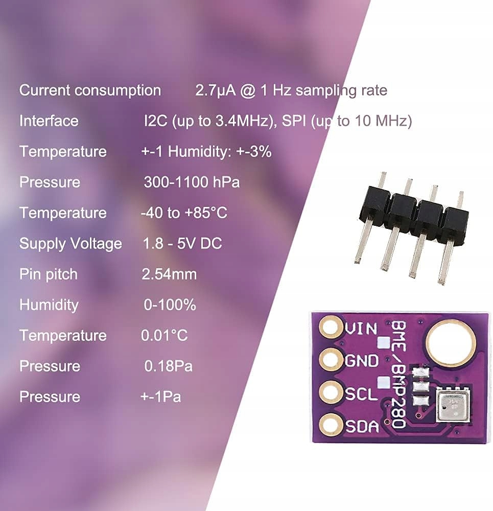 - BME280 представляет собой комбинацию цифрового датчика влажности, давления и температуры. Он может работать в трех режимах мощности: спящем, обычном и принудительном.
