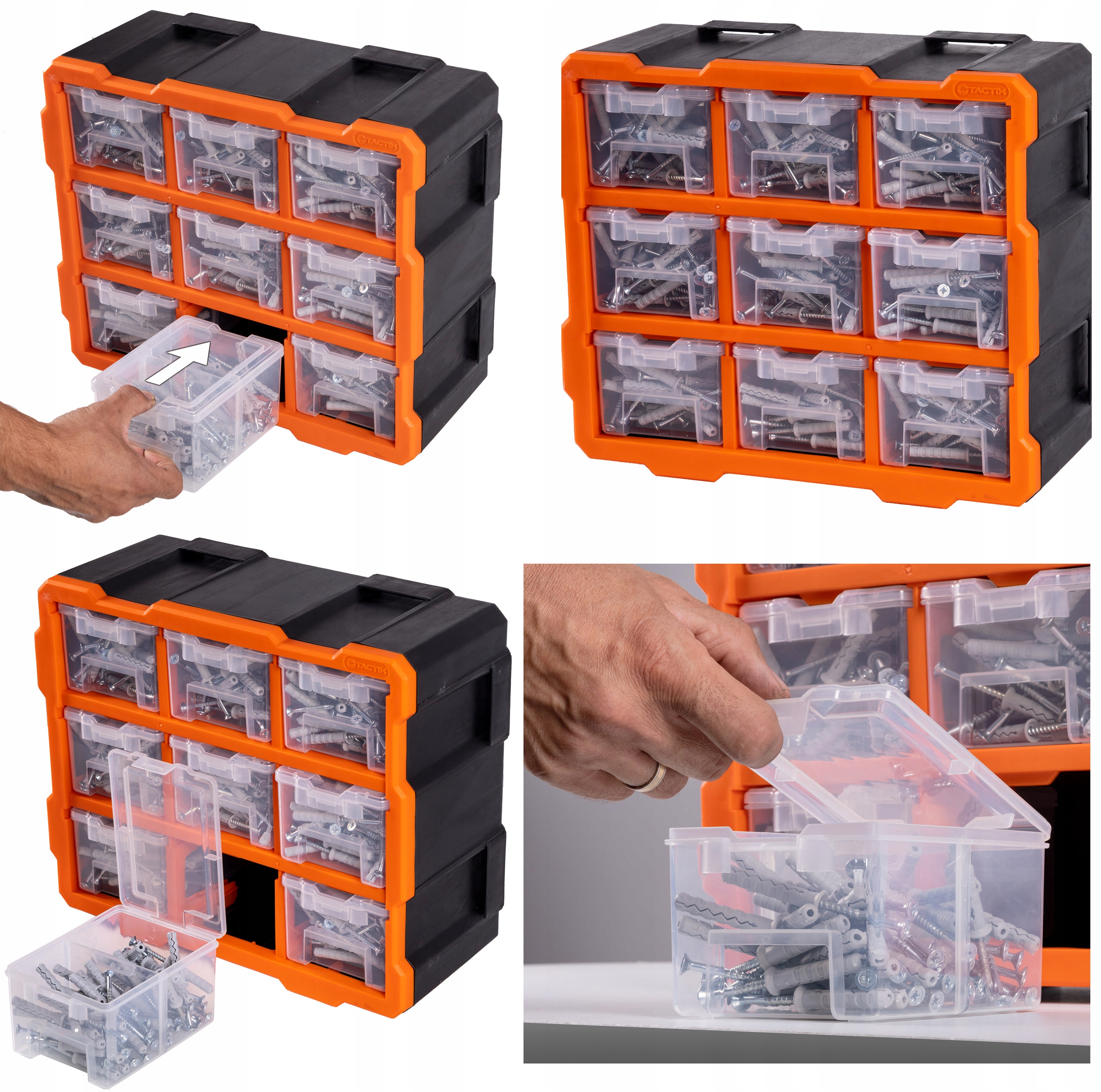 Органайзер позволяет удобно хранить и переносить мелкие аксессуары. Его можно повесить на стену или поставить на столешницу. В коробке находятся 9 прозрачных контейнеров для хранения винтов, болтов, шайб, кабельных наконечников и других мелких элементов. Каждый контейнер имеет съемную перегородку, повышающую функциональность, ручку для удобного извлечения, а корпус конструкции имеет замок, защищающий от случайного выпадения из ящика. Подходит для профессионального использования в мастерских, гаражах, а также дома и для хобби.