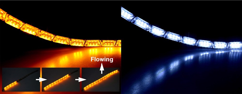 Возможность подключения только белого света в качестве дневных ходовых огней, красный кабель «+12В», черный кабель «-12В» или дневные ходовые огни и поворотники, желтый провод подключить к «+» направления. , что создаст эффект волны при включении поворотников.