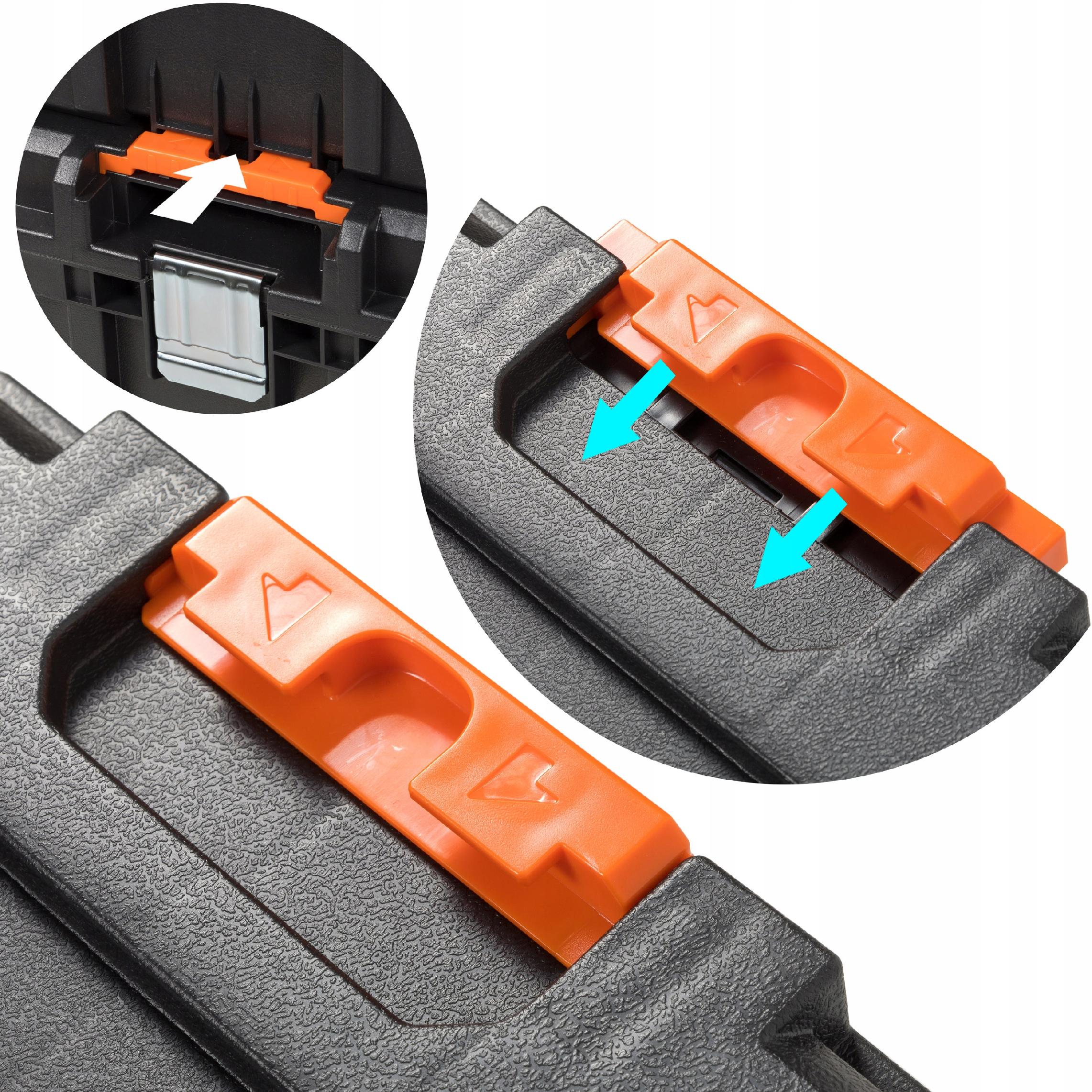Ящик для инструментов благодаря встроенной складной нескользящей ручке легко переносить , даже с тяжелым содержимым. В большом грузовом отсеке можно разместить инструменты длиной около 50 см, и если нам не нужно все содержимое ящика в данный момент, мы можем перевезти только некоторые предметы в одном съемный лоток с ручкой.
