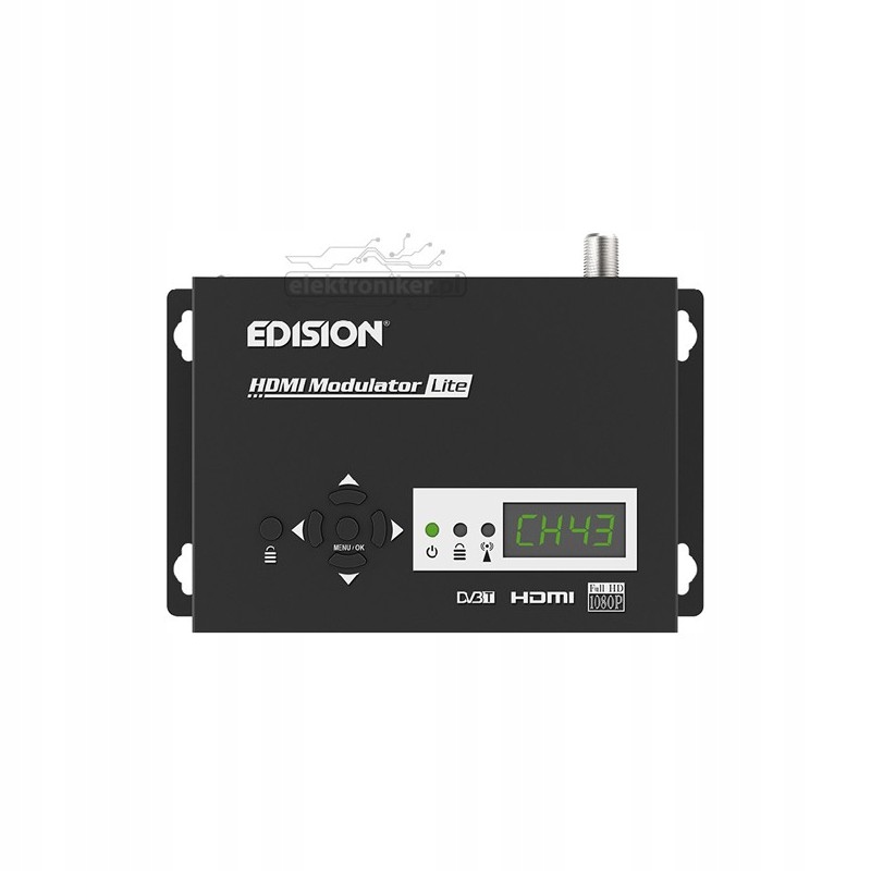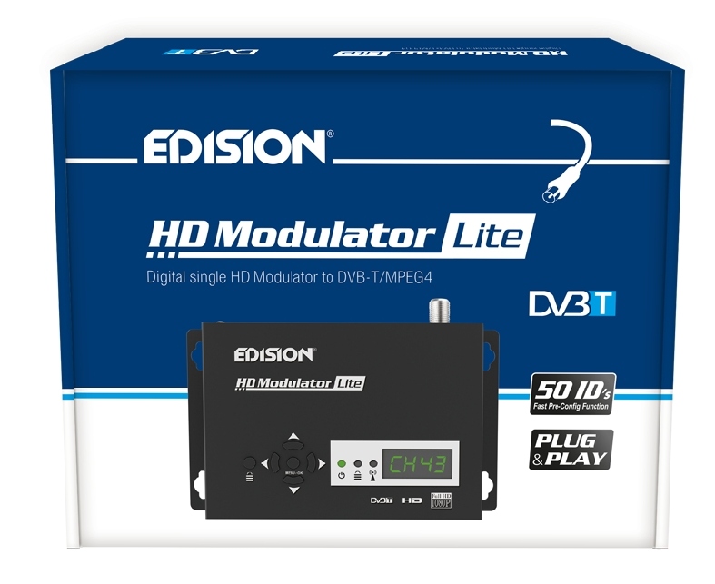 Модулятор EDISION LITE — многофункциональное устройство, модулирующее входной сигнал, поступающий на разъем HDMI в Стандарт DVB-T COFDM. На него можно подавать сигналы как SD, так и Full HD. Имеет входы: HDMI, USB и выход F.