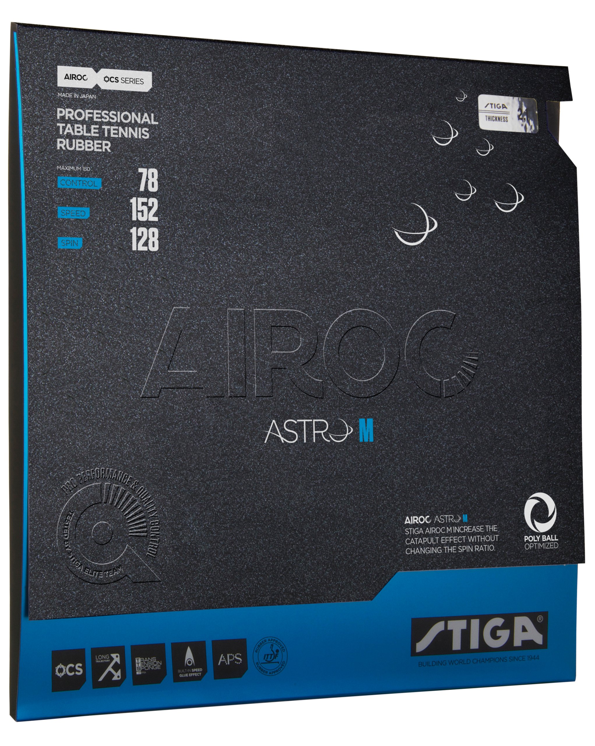 AIROC ASTRO M — Исследования показывают, что новые пластиковые мячи, одобренные ITTF, обладают меньшей способностью создавать и поддерживать вращение. Astro M был создан для устранения этой проблемы. STIGA Airoc Astro M использует новейшую технологию поддержки OCS (кислородная капсульная система) для увеличения эффекта катапульты без потери вращения. Это позволяет нападающим сохранять те же соотношения вращения и скорости, что и раньше.